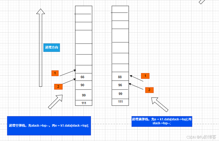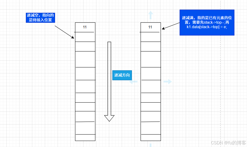 压栈、弹栈原理相同,记住增减方向,空说明指向待插入位置,满说明指向已有元素的位置,不能鸠占鹊巢的话,就识相些先挪窝再添新元素。