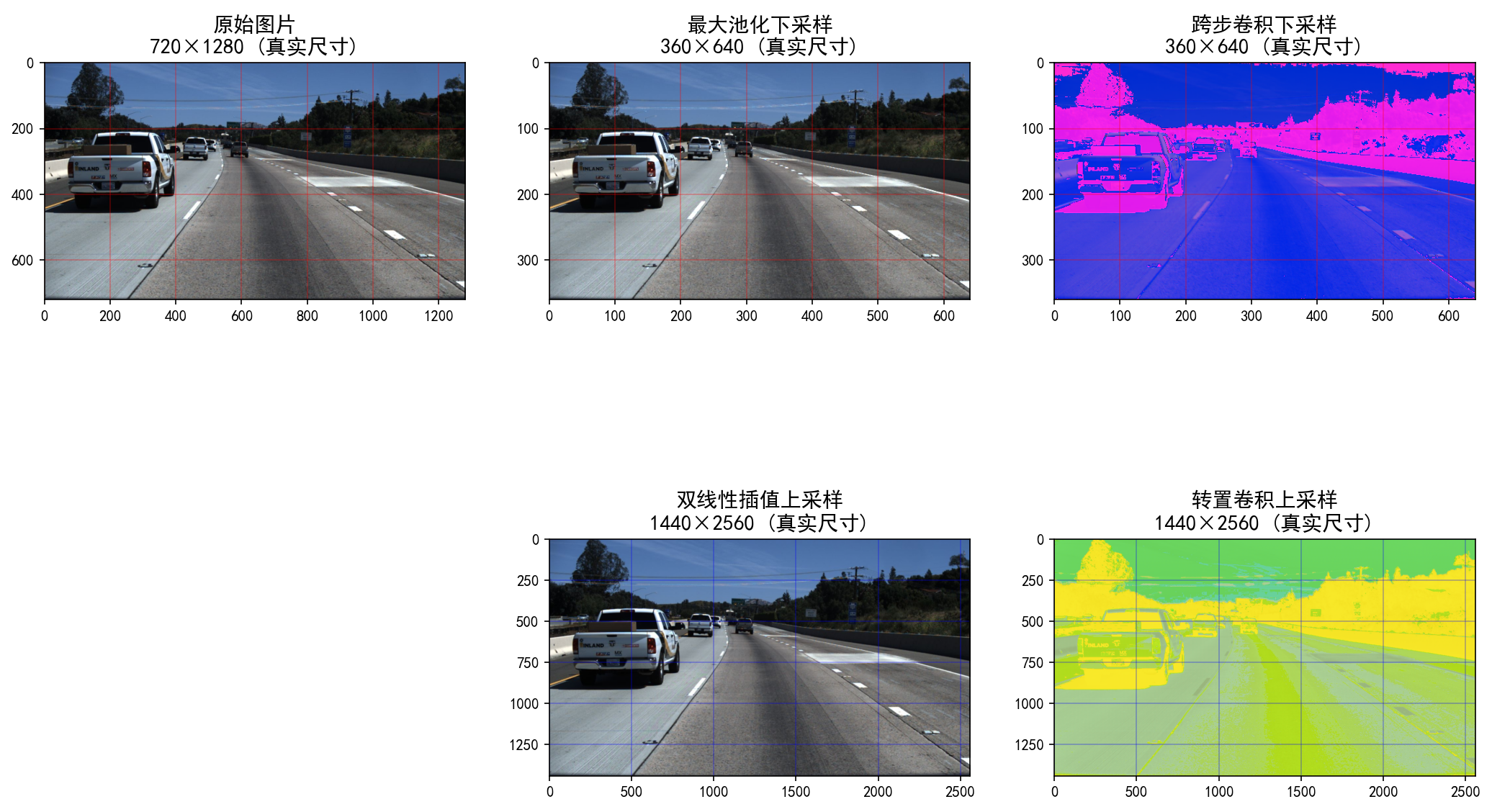 ax6.set_title(f'转置卷积上采样\n{TARGET_HEIGHT*2}×{TARGET_WIDTH*2} (真实尺寸)', fontsize=14)