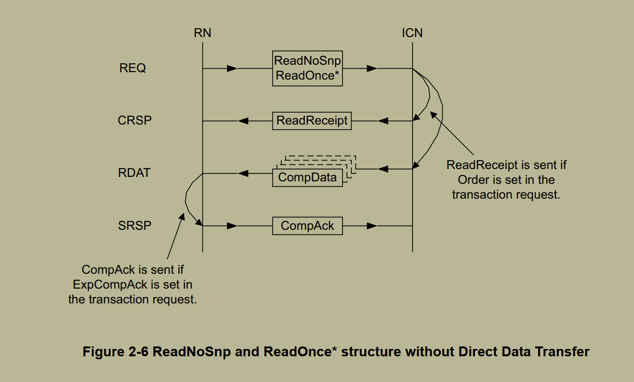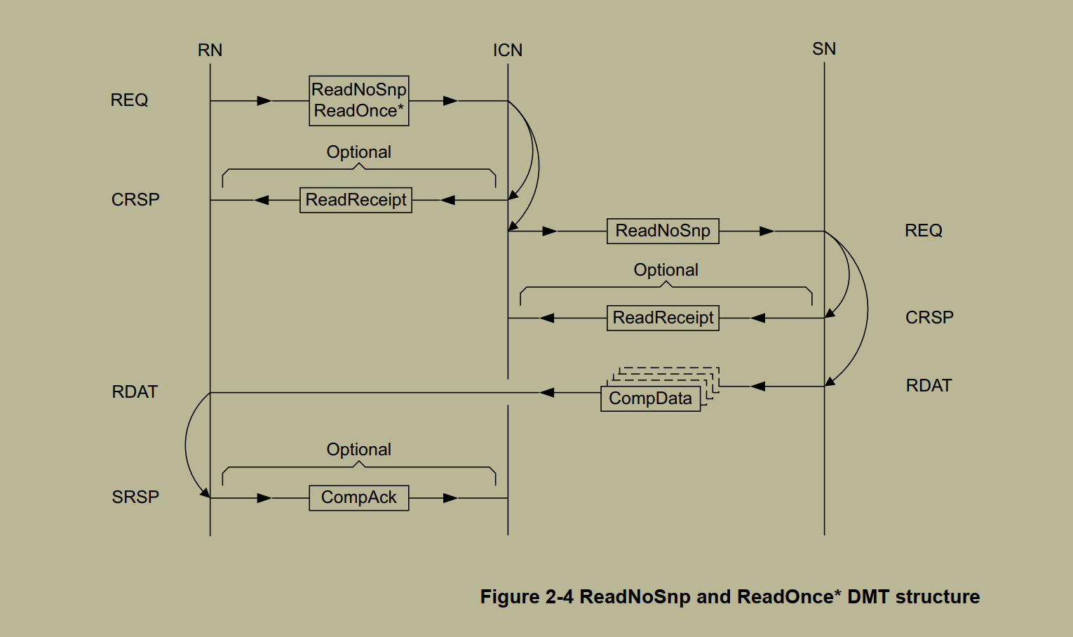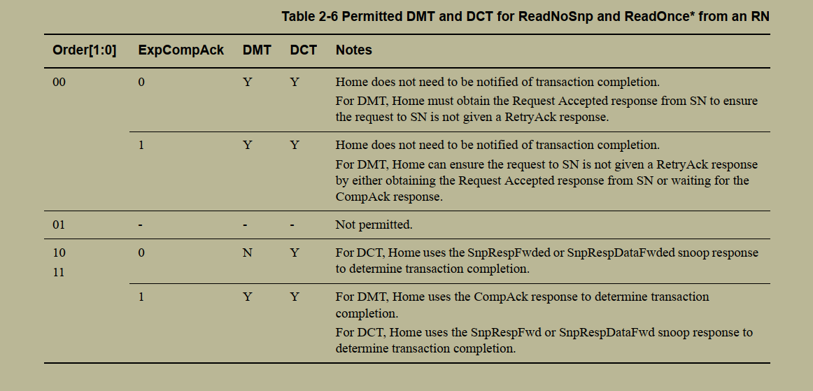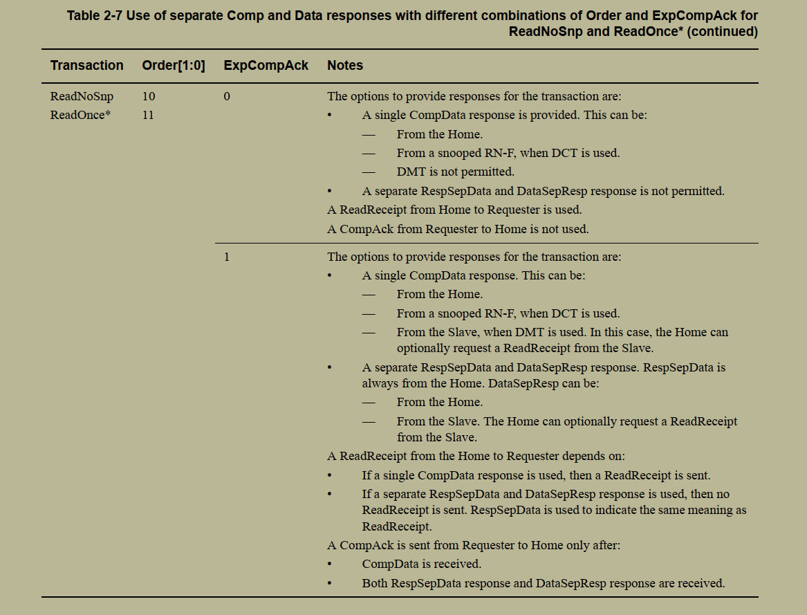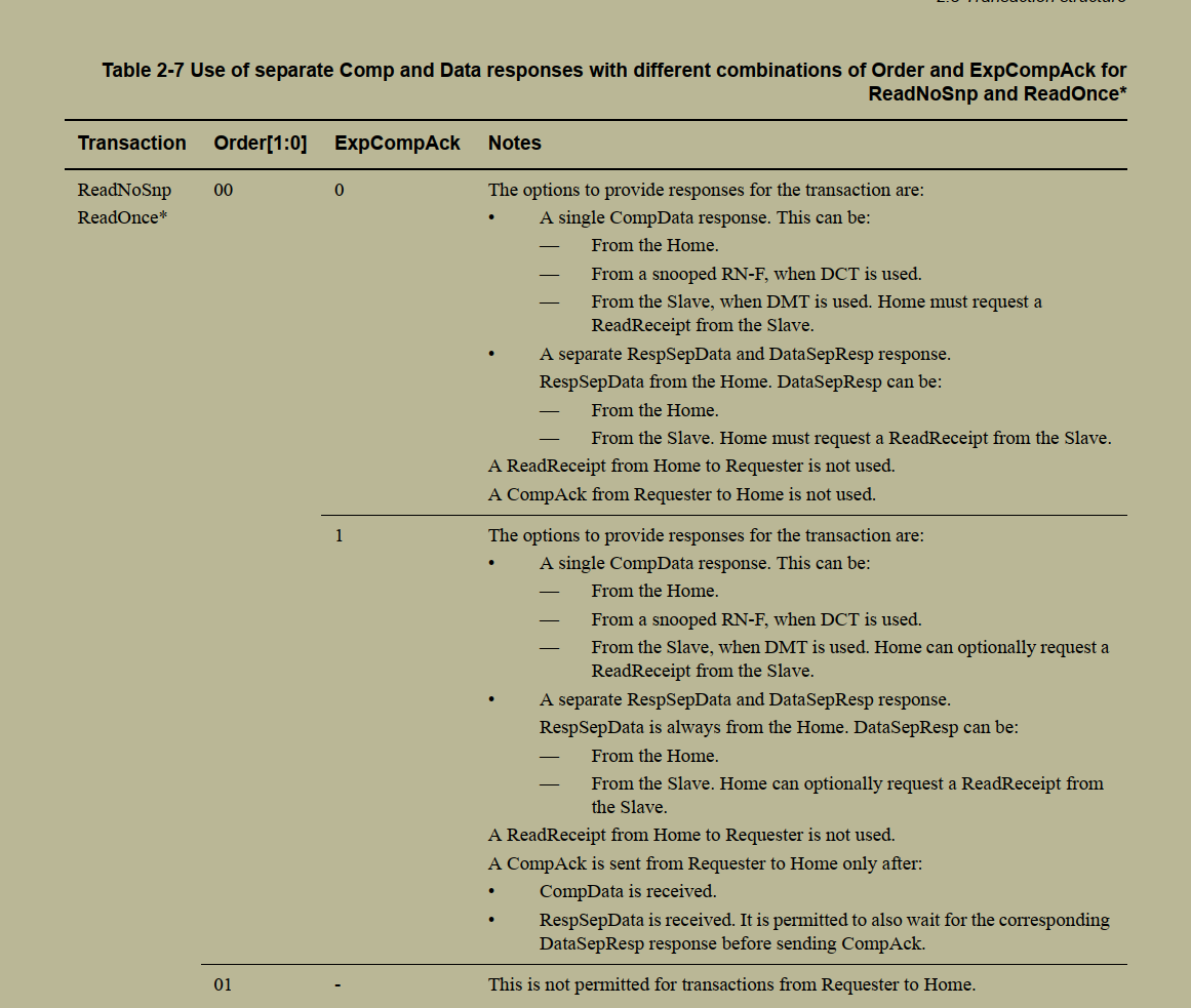 • 从 HN 到 SN 的 ReadNoSnp 和 ReadNoSnpSep 的 ReturnTxnID。