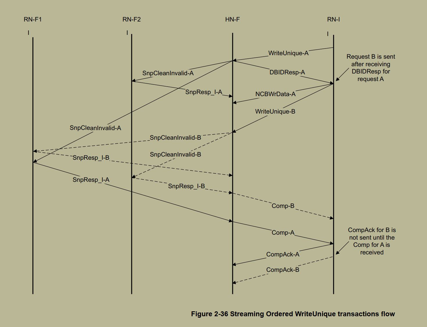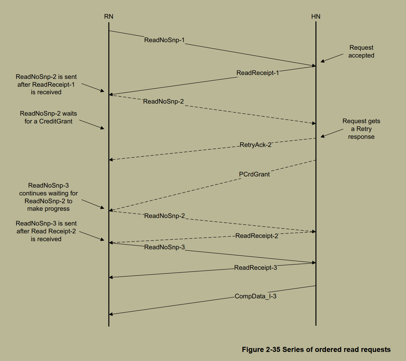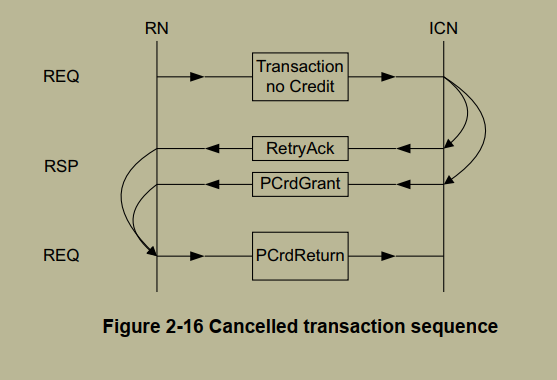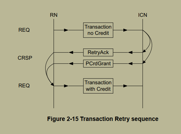 期望 PCrdGrant 相对于 RetryAck 响应被重新排序的情况很少见,因为 RetryAck 和 PCrdGrant 响应之间的延迟通常比互联重排序引起的任何延迟要长得多。