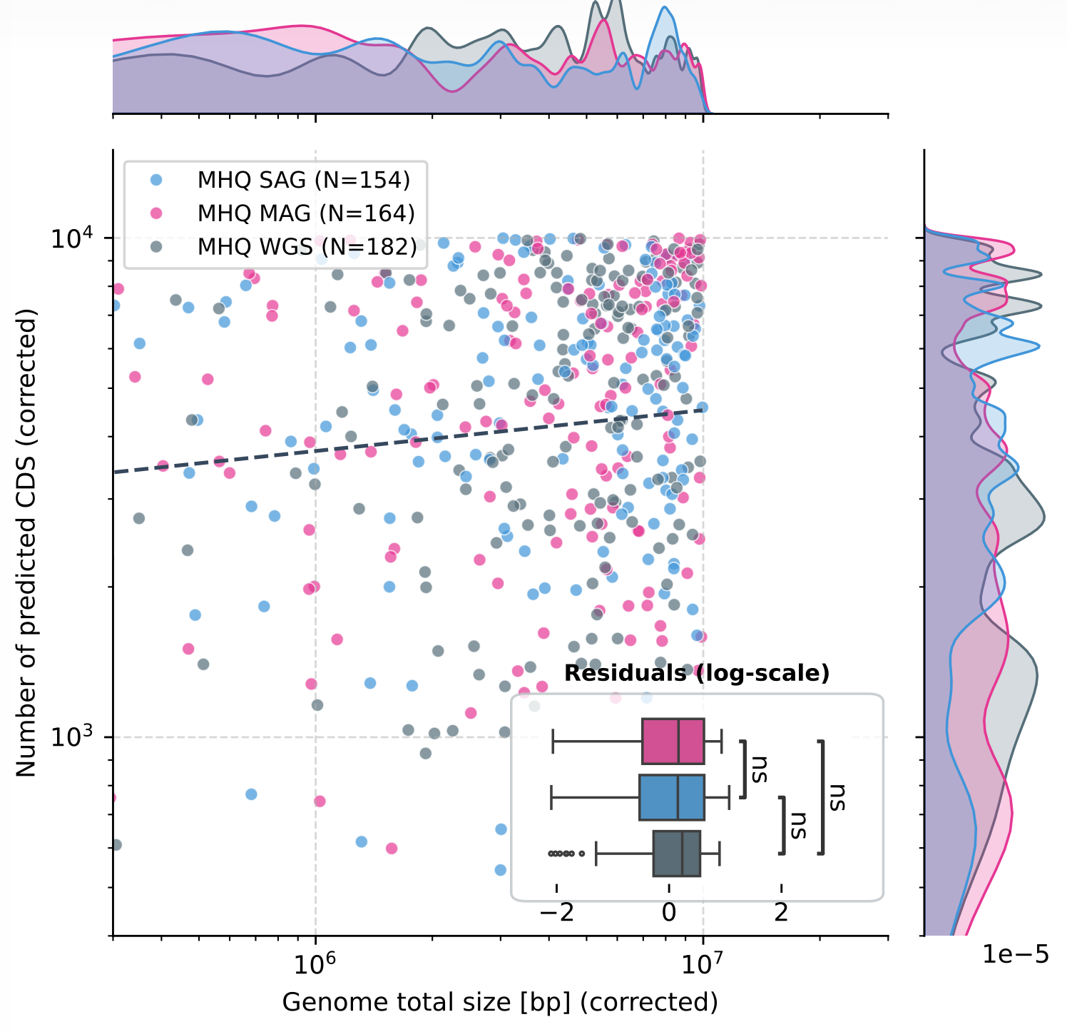 - 在主图中嵌入一个残差箱线图,比较不同基因组类型偏离总体趋势的程度;