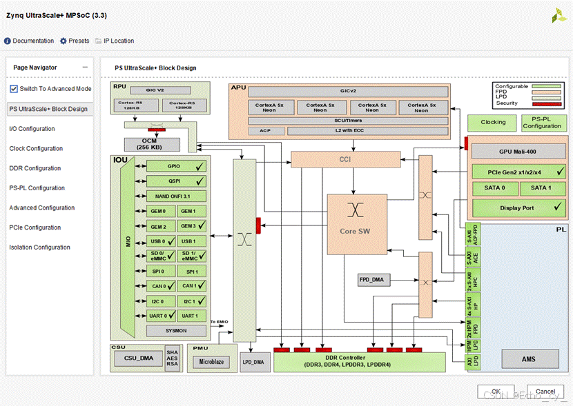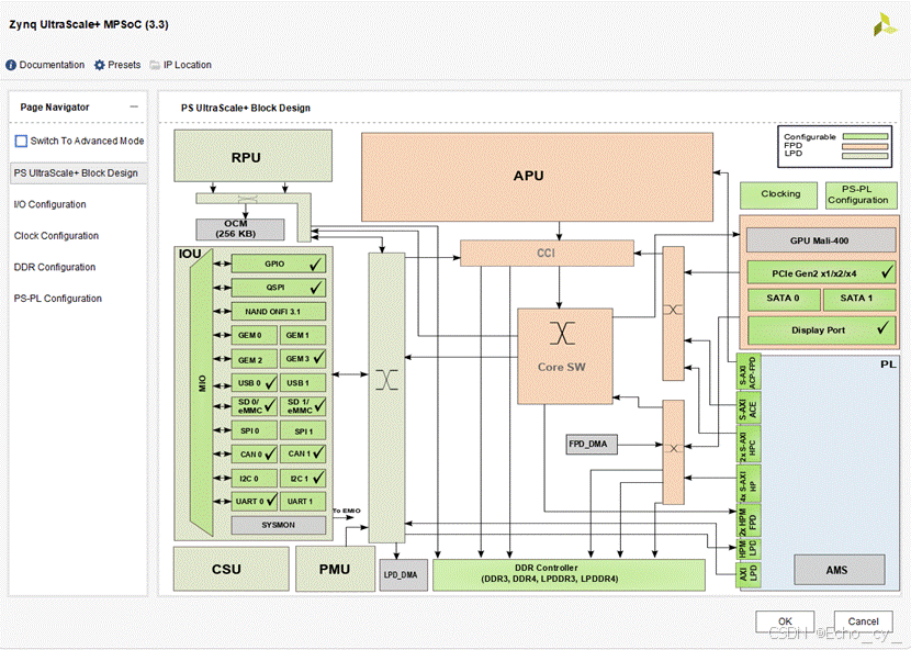 - PS UltraScale+ Block Design 页面显示了 zynq 硬核的整体架构图,其中绿色部分是可配置模块,可以点击进入相应的编辑界面进行配置,当然也可以在左侧导航栏选择相应的编辑界面。