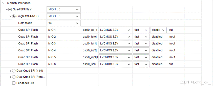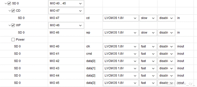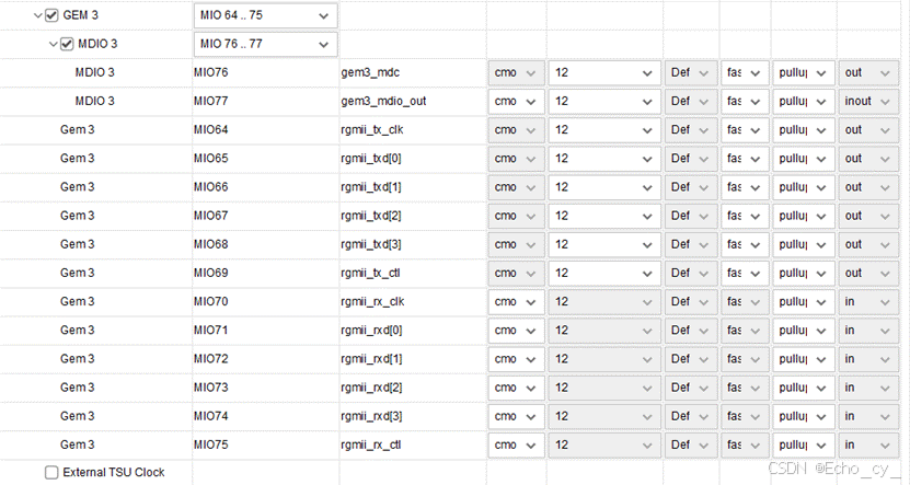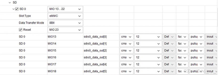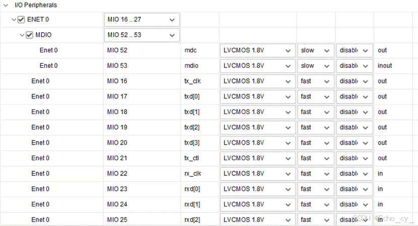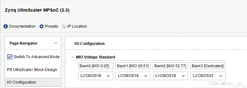- MIO Configuration 页面可以为不同的I/O 外设具体配置MIO/EMIO引脚,例如电平标准等。