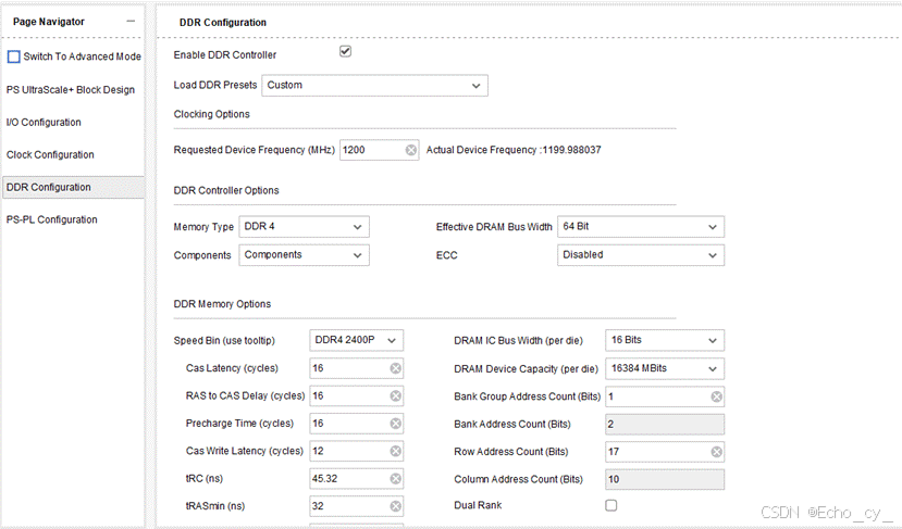 - DDR Configuration 页面用于设置 DDR 控制器配置信息。