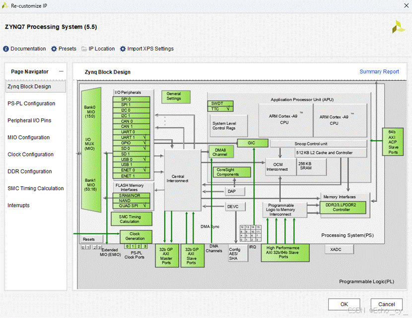 - PS-PL Configuration 页面能够配置 PS-PL接口,包括AXI、HP和ACP总线接口。