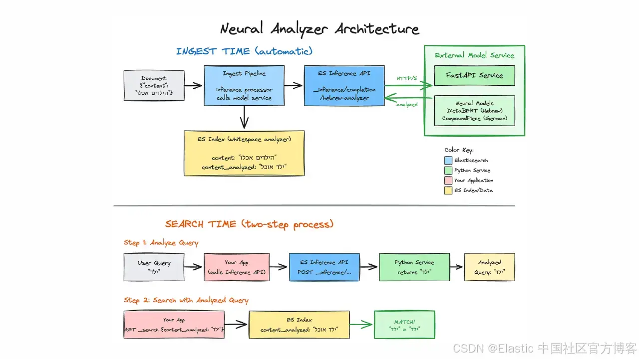 该服务将 Elasticsearch 与神经模型连接。在索引时,Elasticsearch 管道调用此 API 来分析并存储文档字段;在搜索时,应用程序调用它来处理用户查询。你可以将其部署在任意基础设施上,包括 EC2、Lambda 或 SageMaker。