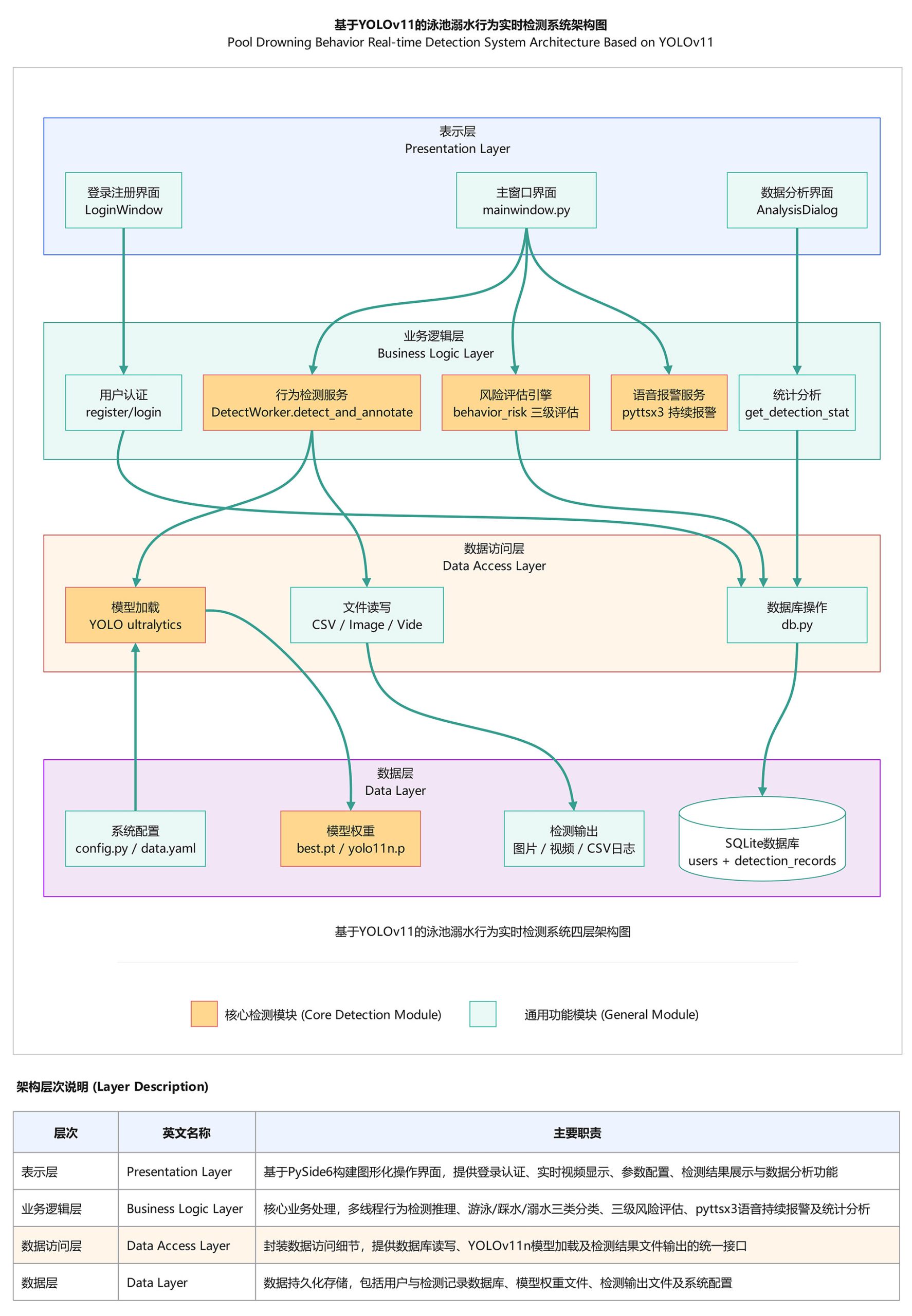 本系统采用Python 3.12开发,基于Ultralytics YOLOv11深度学习框架实现目标检测,使用PySide6构建图形用户界面,通过OpenC V进行图像和视频处理,采用PIL实现中文标签渲染,利用DetectWorker多线程异步处理技术保证界面流畅性,集成pyttsx3语音引 擎实现溺水持续报警,并使用SQLite数据库实现数据持久化存储和查询,系统架构清晰、模块化设计,便于功能扩展和维护。