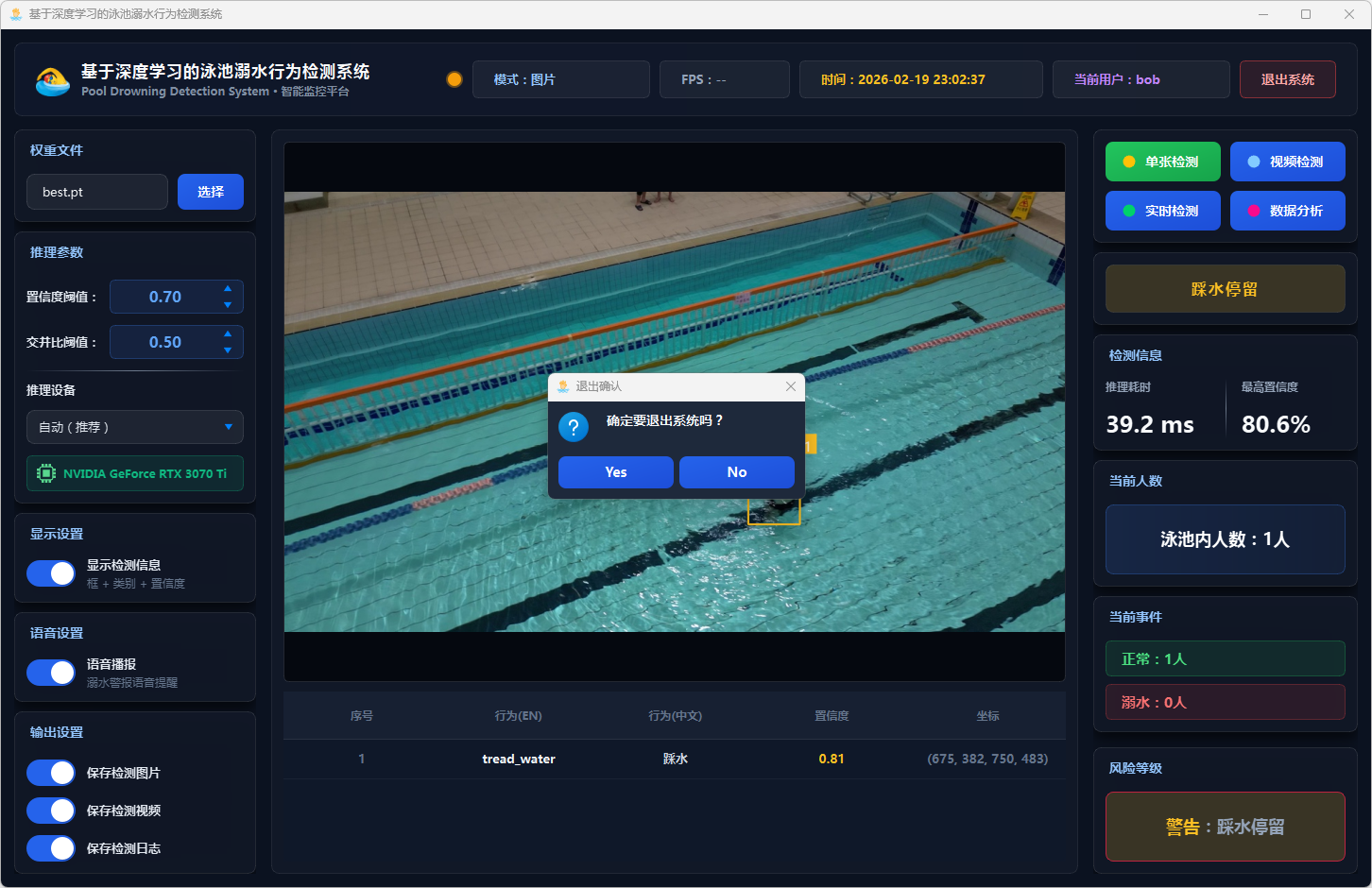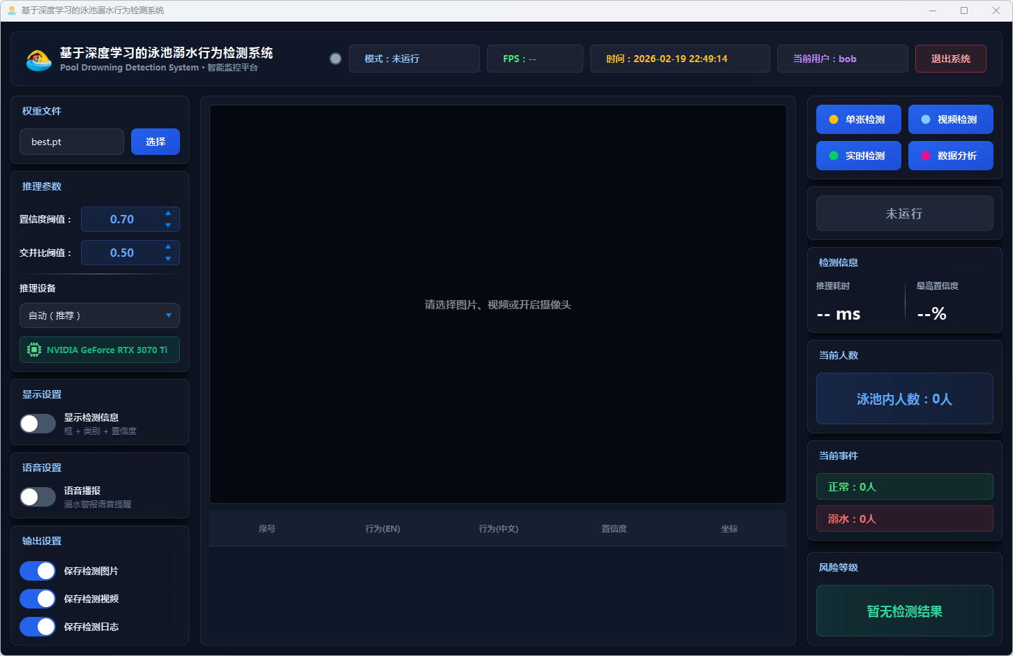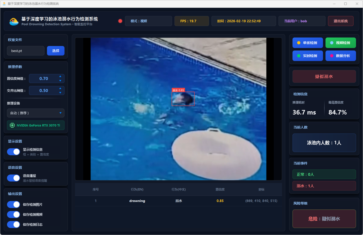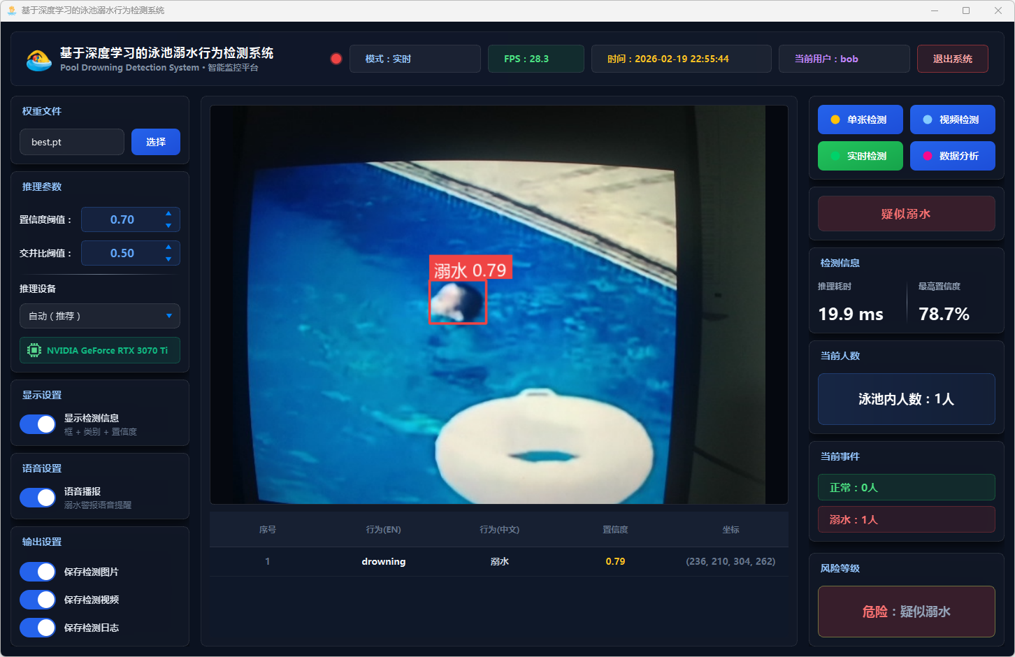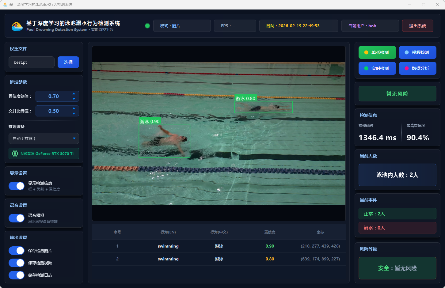 实验结果表明,该系统能够准确识别泳池场景中的三类行为,在GPU加速条件下可达到实时检测帧率,具备较高的检测精度与响应速度。系统整体运行稳定,交互体验良好,可为泳池安全监控提供一种可行的智能化辅助方案。
