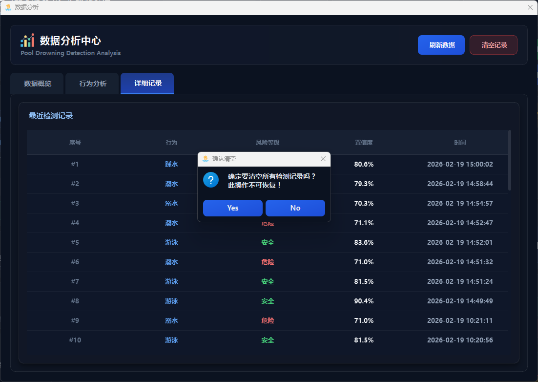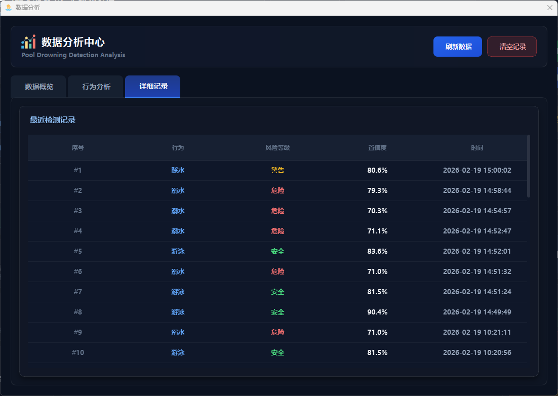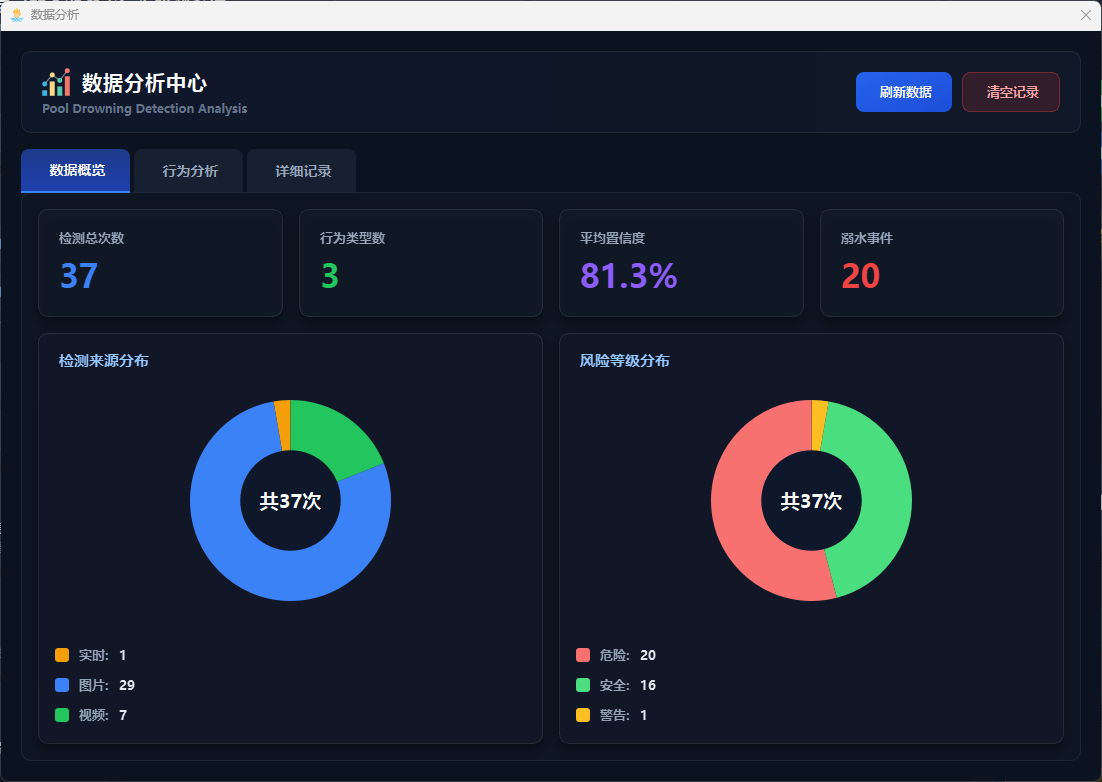 数据分析模块提供检测数据的可视化展示和统计分析功能,用户点击"数据分析"按钮打开独立的分析窗口,包含总览、行为分析、详细记录三个标签页,可查看检测总数、行为类型分布、平均置信度、溺水次数等关键指标,通过条形图、饼图、统计卡片等形式直观展示数据分布,支持查询历史检测记录(存储在SQLite数据库data/app.db)、清空当前用户记录等操作,实现检测数据的持久化存储和全面分析。