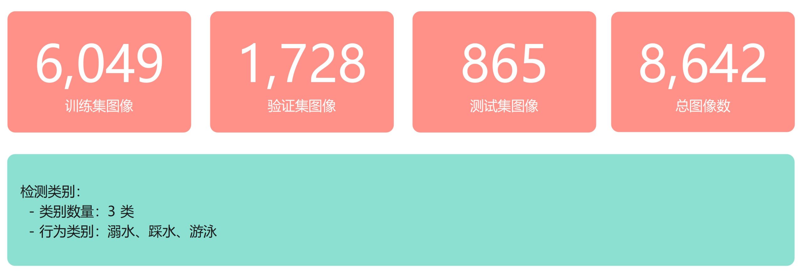 数据集涵盖泳池场景,包含不同光照、角度和水面反光条件下的swimming、tread_water、drowning三类行为标注,共8,642张图像。