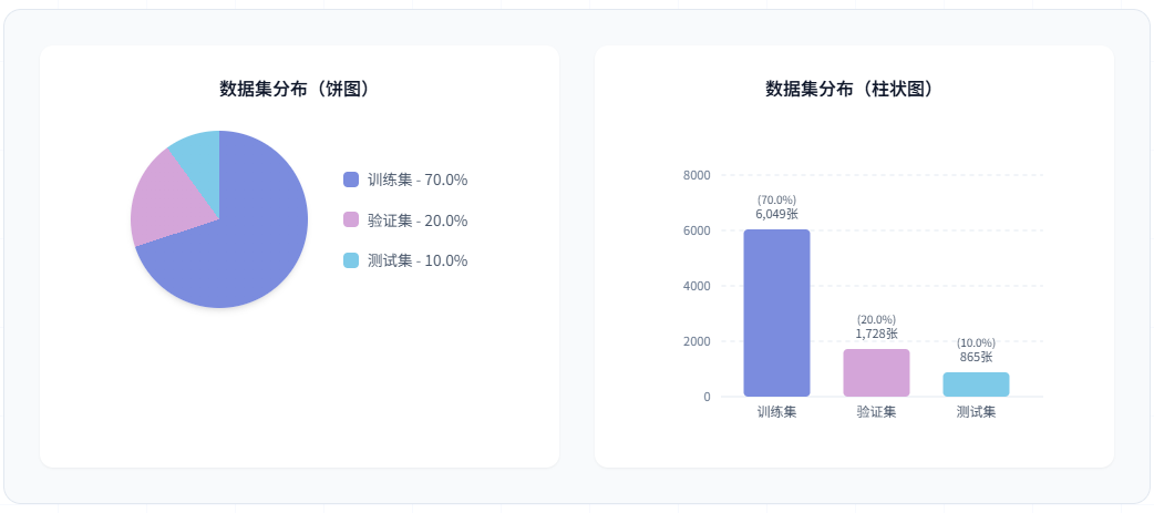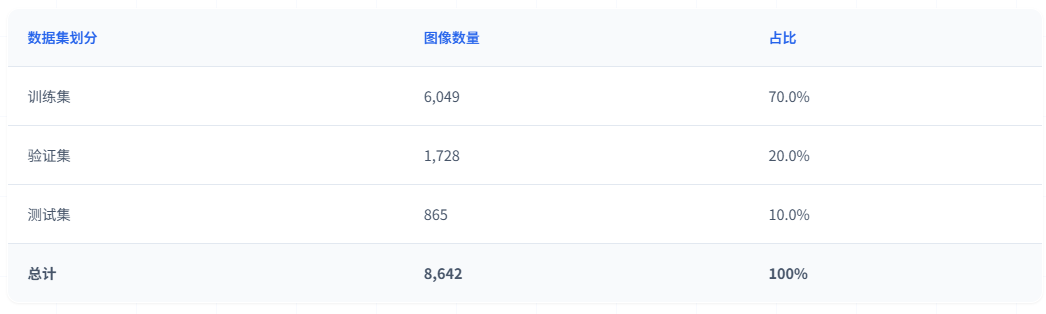 训练集用于模型的参数学习和特征提取能力训练。验证集用于训练过程中的性能监控和超参数调优,帮助选择最优模型。测试集用于最终的性能评估,确保模型在未见过的数据上具有良好的泛化能力。