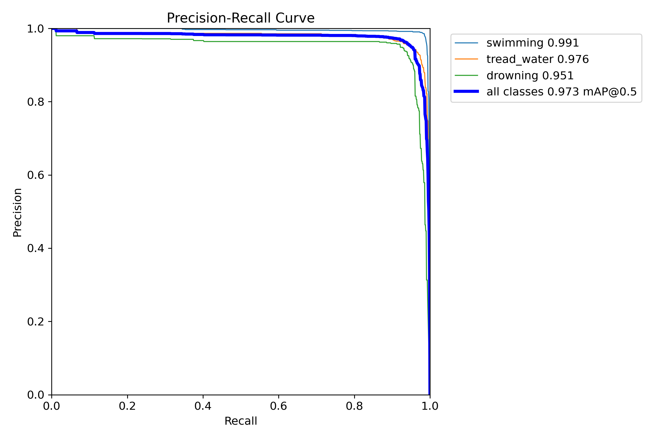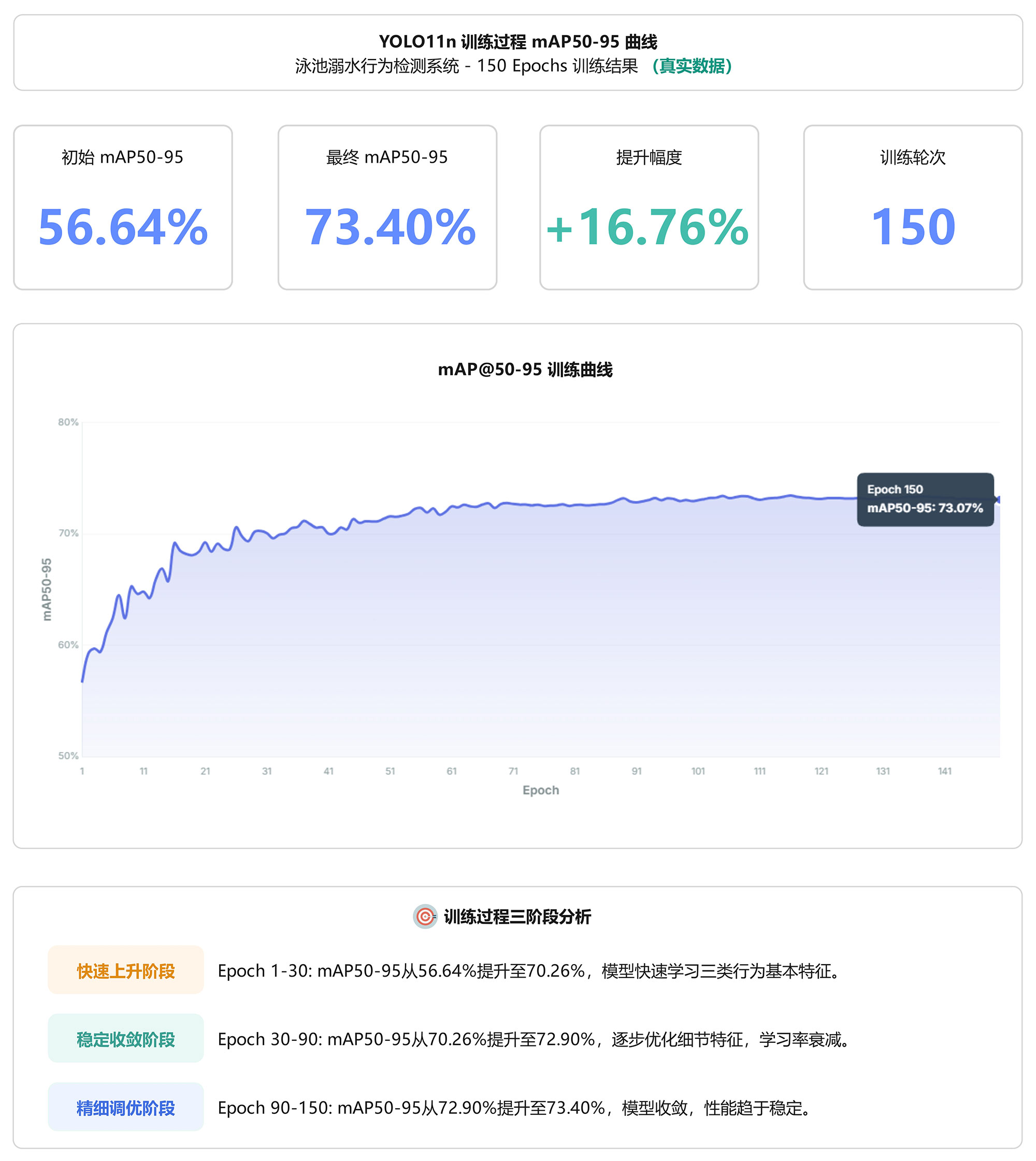 该曲线展示了模型在泳池溺水行为检测任务上的学习能力和收敛特性,验证了训练策略的有效性。最终73.4% mAP@0.5:0.95配合97.3% mAP@0.5,表明模型在严格评估标准下仍保持稳定性能