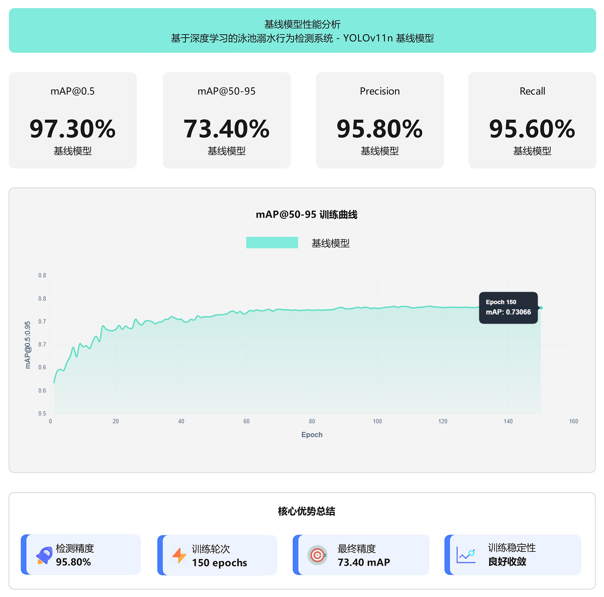 YOLO11n基线模型在泳池溺水行为检测任务上表现出色,经过150轮训练后,在1,728张验证集上达到97.3% mAP@0.5和73.4% mAP@0.5:0.95的检测精度。模型的精确率为95.8%,召回率为95.6%,误识别率和漏检率均控制在5%以内,能够满足实际应用需求。