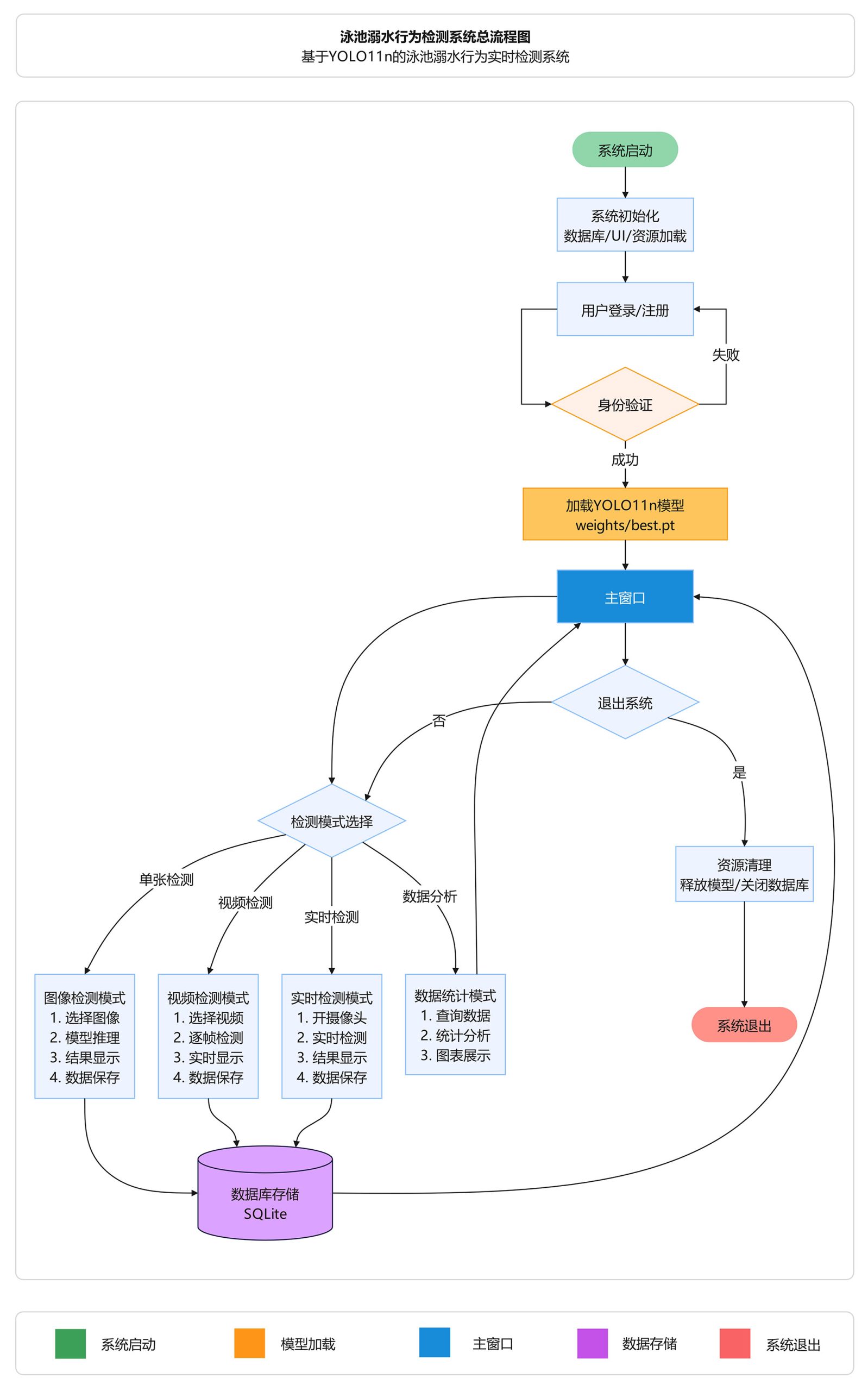 本系统基于YOLO11n深度学习模型,实现了泳池场景下游泳、踩水、溺水三类行为的智能检测与预警。系统采用PySide6构建图形用户界面,提供图片检测、视频检测、实时摄像头检测三种工作模式,并集成了三级风险评估、语音持续报警、数据统计分析、检测记录管理等功能,为泳池安全监控提供高效、可靠的技术支撑。