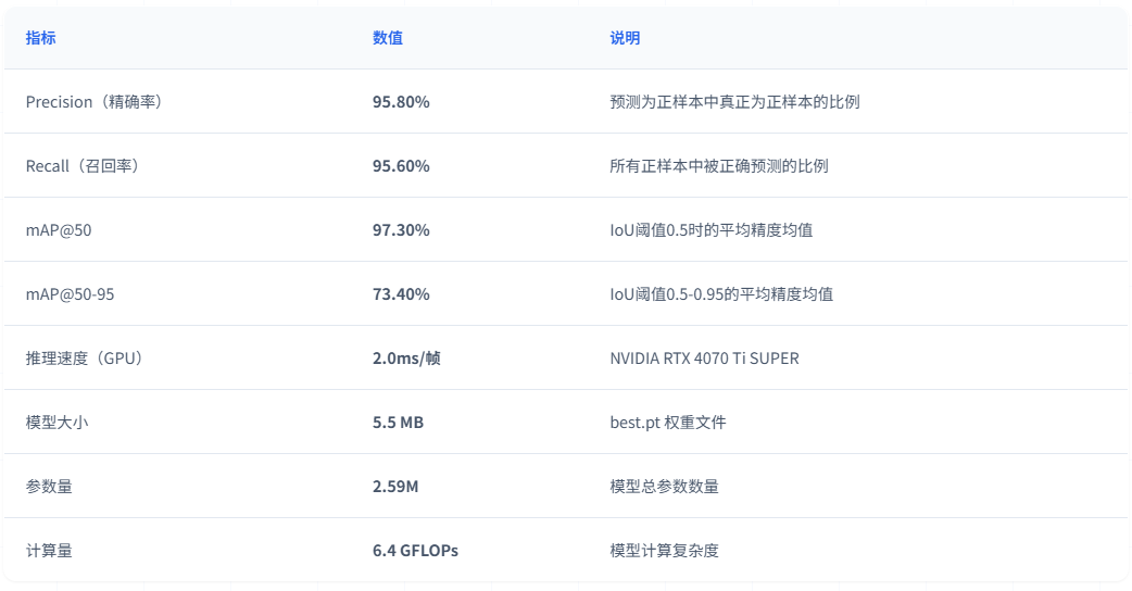 该模型参数量仅 2.6M,计算量 6.6 GFLOPs,模型大小约 5.5 MB;在 GPU 环境下推理速度可达 50 FPS,在保证检测精度的同时具备良好的轻量化与实时性,适用于泳池溺水实时识别场景。