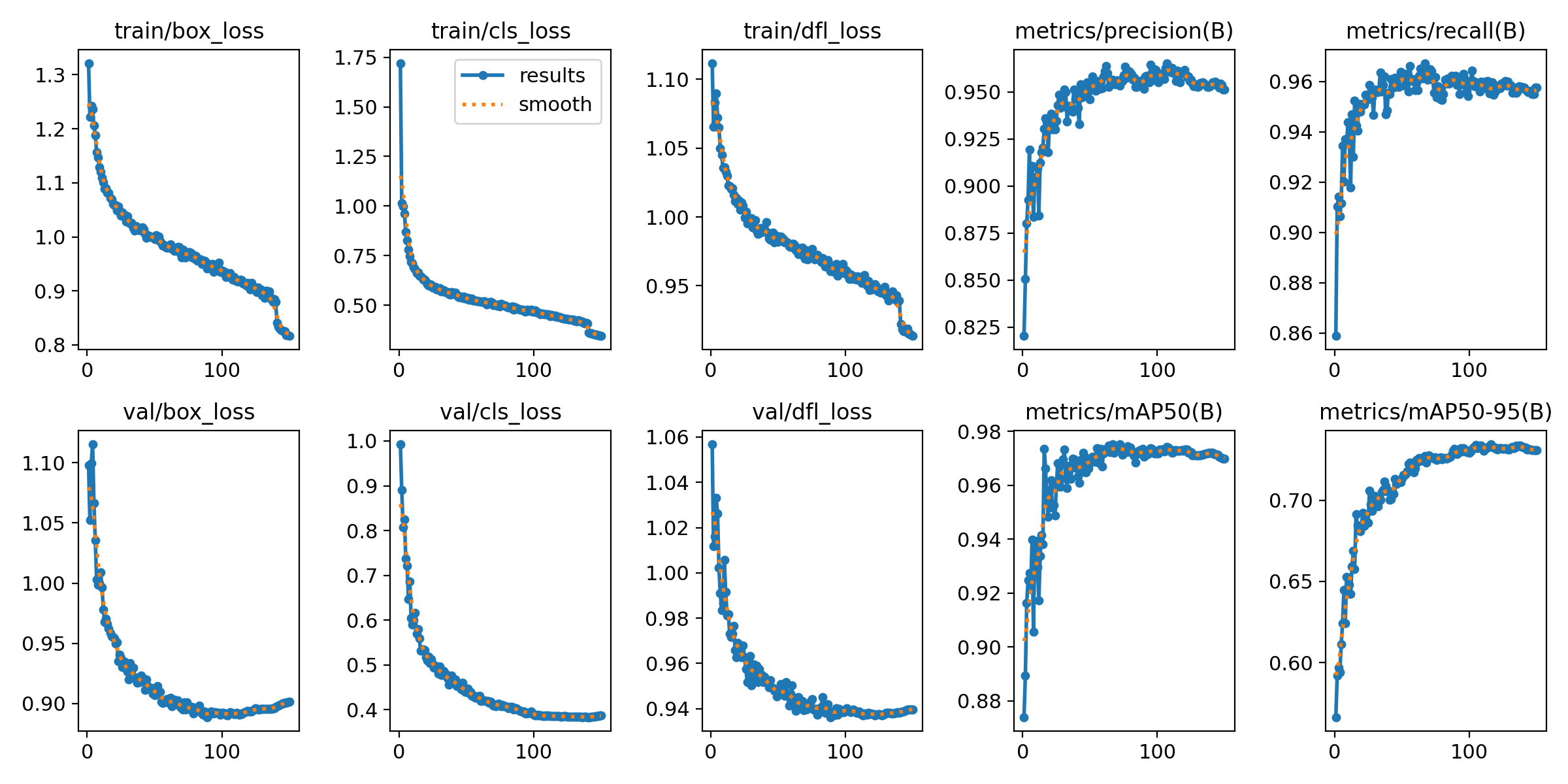 图中展示了10个关键指标的训练过程:训练损失(box/cls/dfl)、验证损失(box/cls/dfl)、精确率、召回率、mAP@50和mAP@50-95