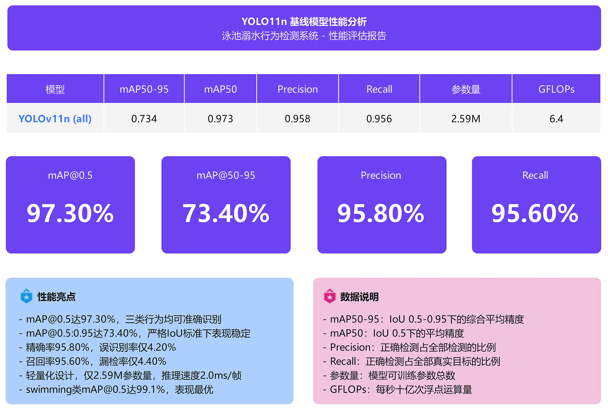YOLO11n基线模型以2.59M参数量、6.4 GFLOPs计算量实现高效推理,在泳池溺水行为检测任务上达到97.3% mAP@0.5和73.4% mAP@0.5:0.95的检测精度,精确率95.8%,召回率95.6%,支持GPU加速和CPU部署,兼顾轻量化与实时性。