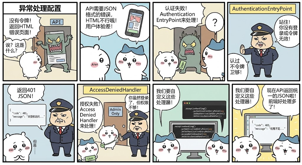 Spring Security默认的异常处理行为是返回HTML错误页面,适合传统Web应用。但对于RESTful API来说,这通常不是期望的行为:
