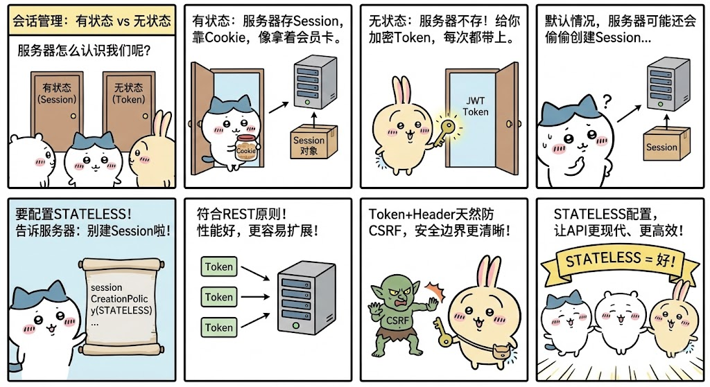 这行代码告诉Spring Security:不要创建HTTP Session,也不要依赖Session来管理用户认证状态。
