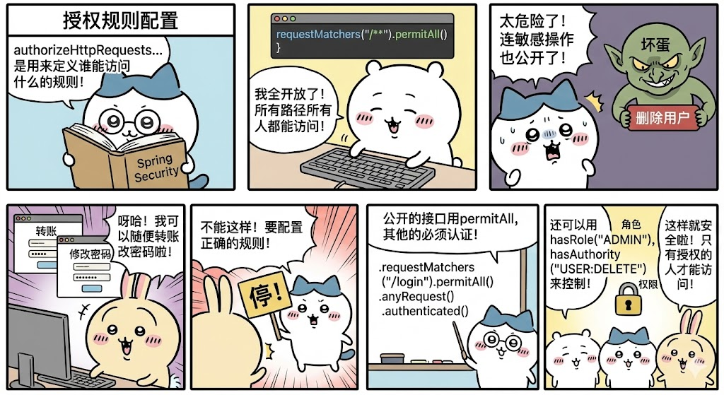 如果只写了requestMatchers("/**").permitAll()且没有后续规则,意味着所有接口都对全世界开放,包括删除用户、转账、修改密码等敏感操作。这在生产环境中是极其危险的。