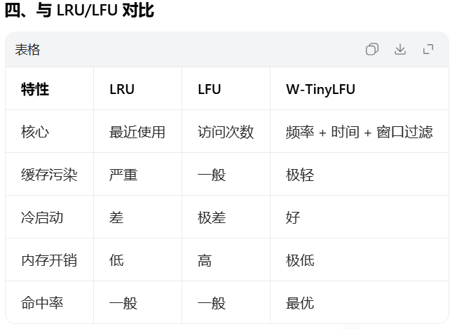 - ✅ 低内存开销:TinyLFU 仅用极小空间统计频率