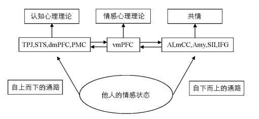 心理理论系统与情感系统之间也被证明存在紧密的联系,Danziger等人(Danziger,Faillenot和Peyron,2009)的研究中,选取了先天性疼痛不敏感的患者作被试,患者不能依靠镜像神经元系统的共同表征表征他人的疼痛,但是在看到他人受疼痛刺激时,表征情绪的脑区仍然被激活,证明患者能通过心理理论系统来理解他人,产生共情反应。