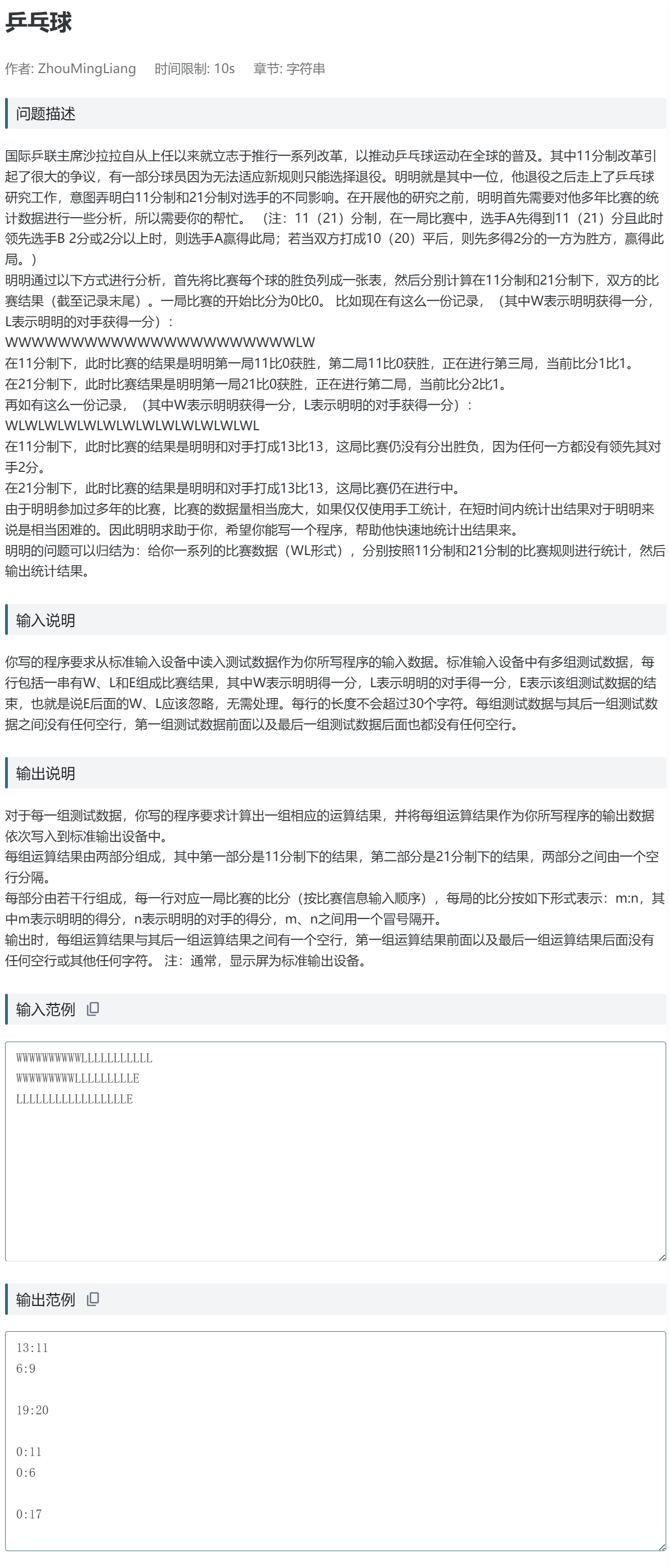 这道题比较繁琐,用两个二维数组来存储两种模式下的已结束局的比分,以及cnt11和cnt21来记录比赛的局数,接着根据比赛规则来统计明明和对方的比分,然后通过if条件来判断当前的比分。特别注意需要单独处理最后一局,原因是:比赛可能在没有达到一局正常结束条件时( 遇到 E 表示比赛结束,或者输入结束**)提前终止。** 最后输出11分制所有局比分和21分制所有局比分。这里把整个过程写成一个**void pingpang(const string& seq,bool&firstgroup)**函数,通过调用pingpang(total,firstgroup);来实现整个过程。注意:string total;// 累积当前组的 W/L 字符序列 ( 不含E), while(getline(cin,line))循环里有四种情况:(1)if(c=='E')(2)else if(c=='W'||c=='L')(3)//其他字符(如空格、换行)忽略 (4)/如果本行没有 E ,继续读下一行,继续累积 total,别忘了