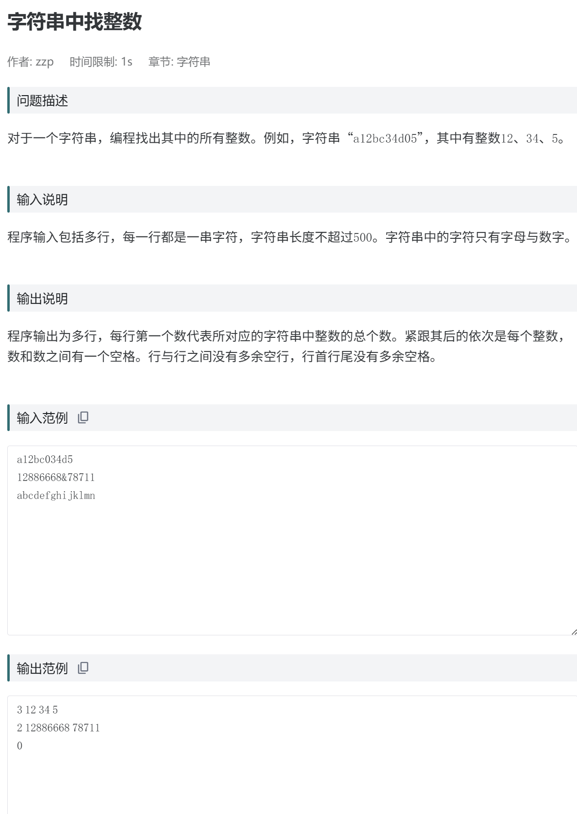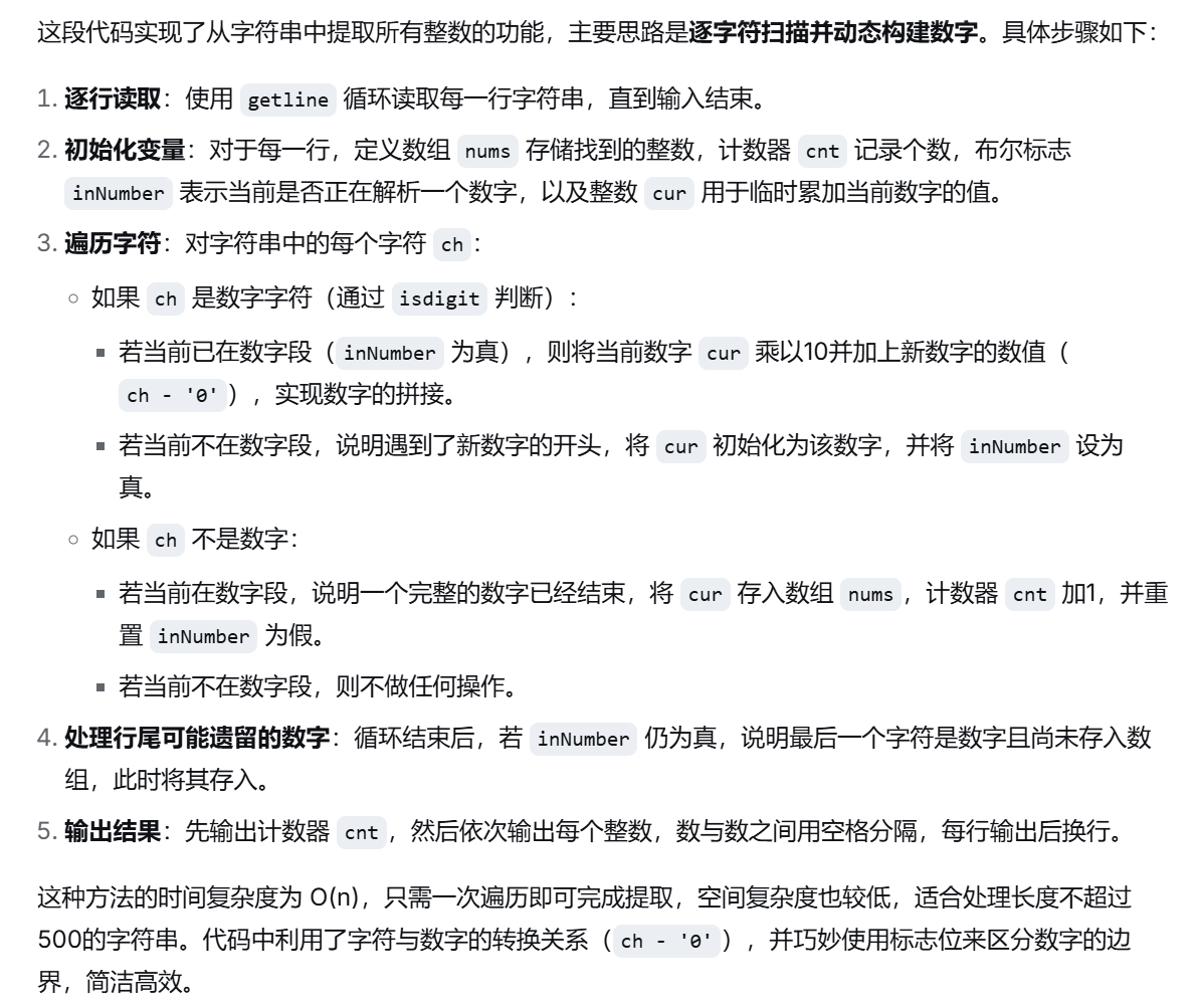 这道题比较复杂,首先需要一个数组来存储找到的整数,然后一个变量来存储当前存储的个数,还需要一个布尔变量来标记当前是否是数字,以及cur来表示每一个数字段的数字值为多少。接着开始遍历每个字符,如果是数字,接着判断是否在数字段,在则计算当前值,不在则初始化为该数字。如果不是数字,接着判断是否在数字段,在则说明遇到了分割的地方,把当前值存下来,如果不在则不做任何操作。最后需要处理行尾可能遗留的数字,//为什么需要这一行?代码逻辑是遇到非数字时才把当前累计的数字存起来,万一如果以数字结尾,最后一段数字就没法被存下来。最后输出数字的个数以及对应的值。