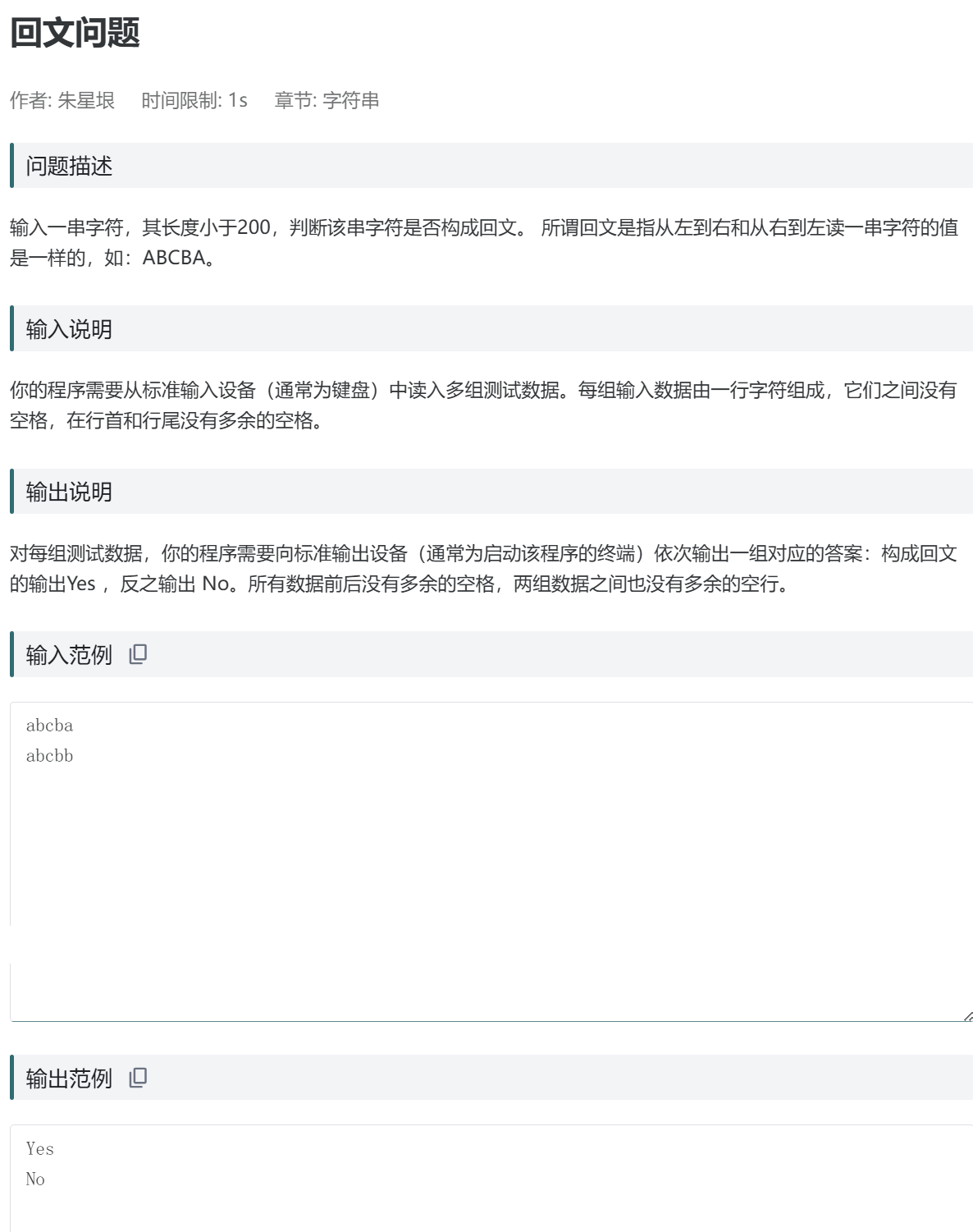 这道题输入字符串之后,需要用两个变量来遍历,一个从头一个从尾,看是否相等,不等则设置一个布尔变量huiwen为false,然后直接break跳出,相同则继续检查,最后输出结果。