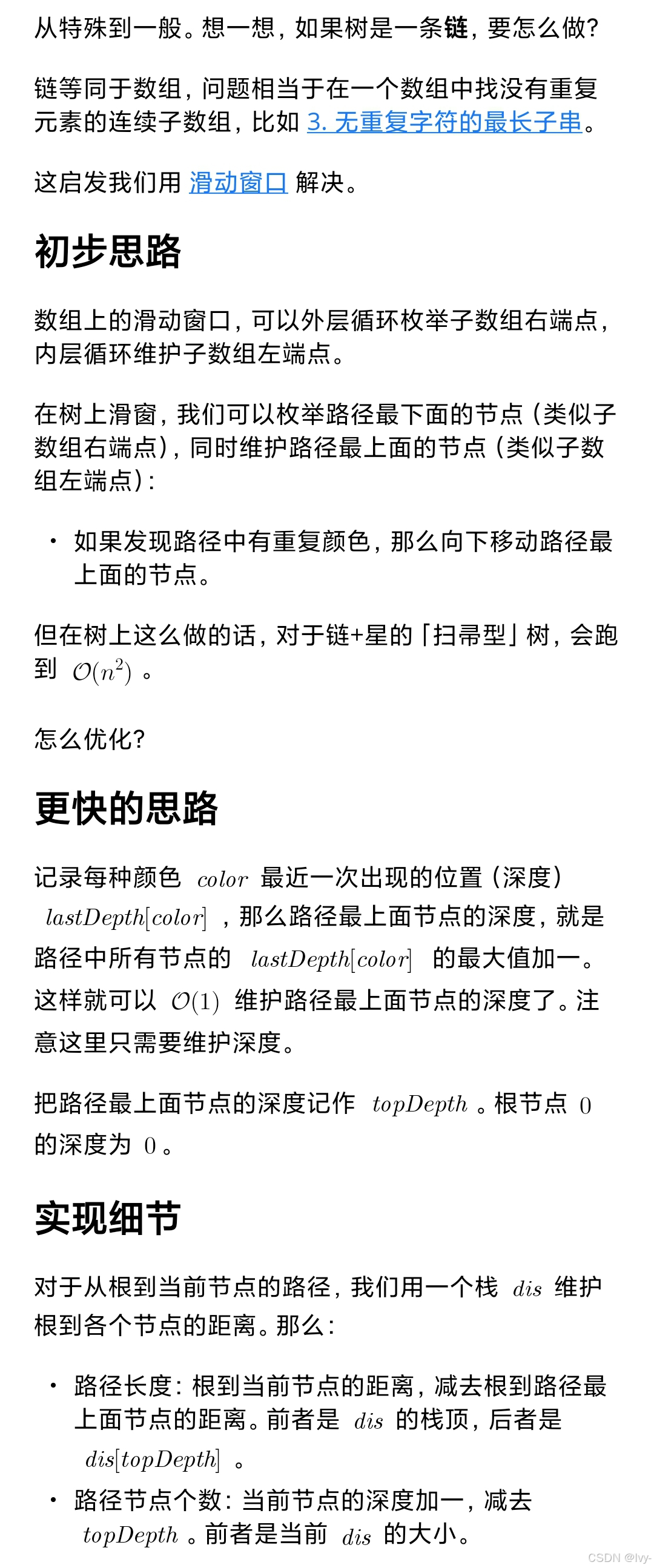 树上滑窗算法,++在树的 DFS 遍历中,维护"窗口内不重复的颜色最近出现深度",动态调整窗口起点,在一次遍历中++高效求出满足"同色不重复"约束的最长路径