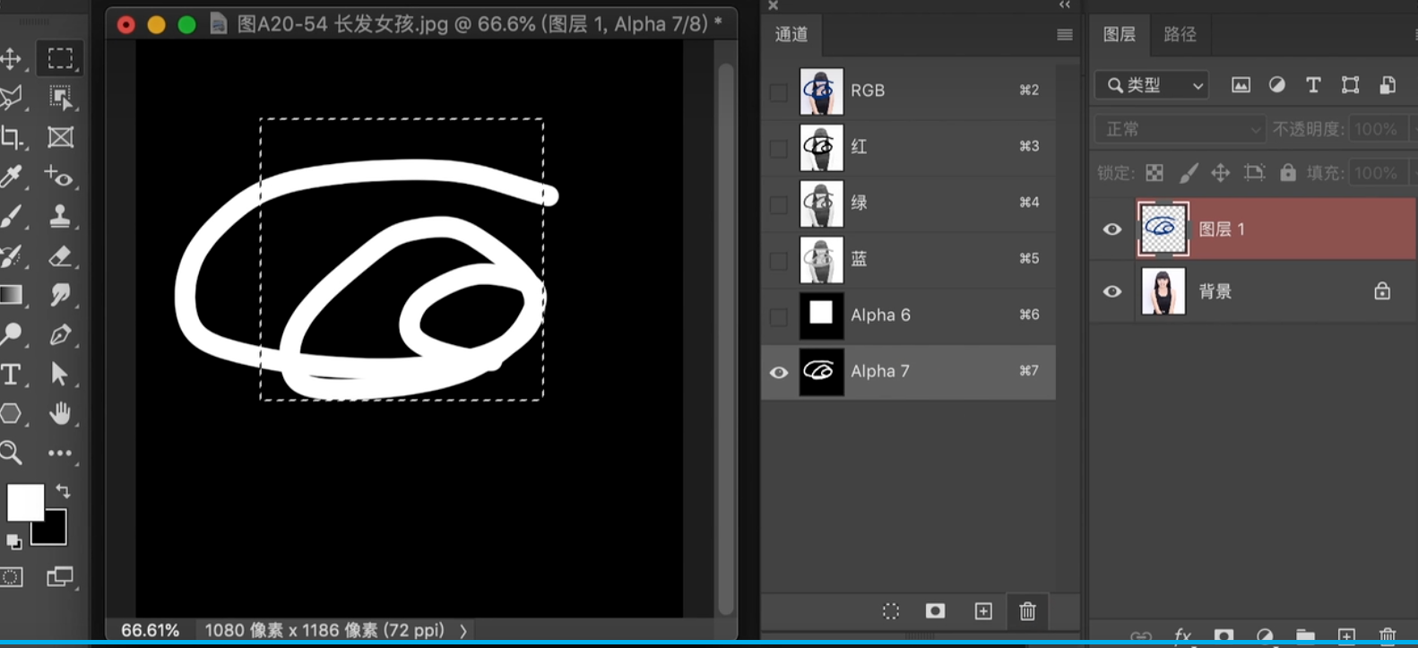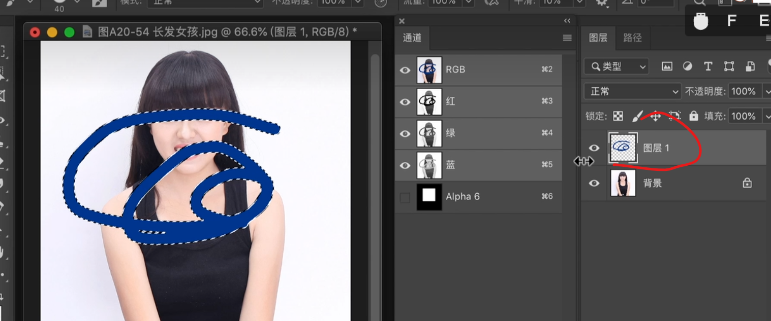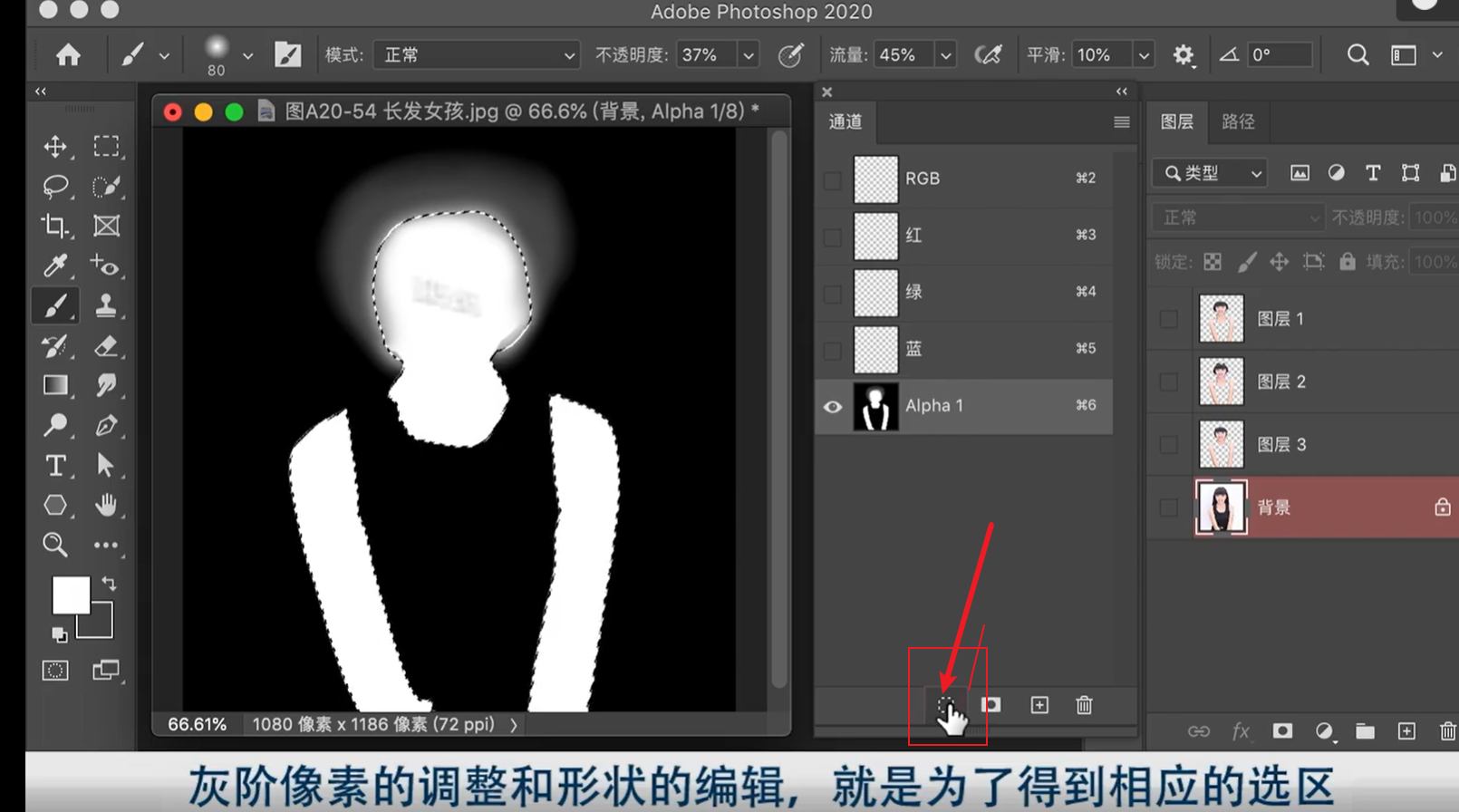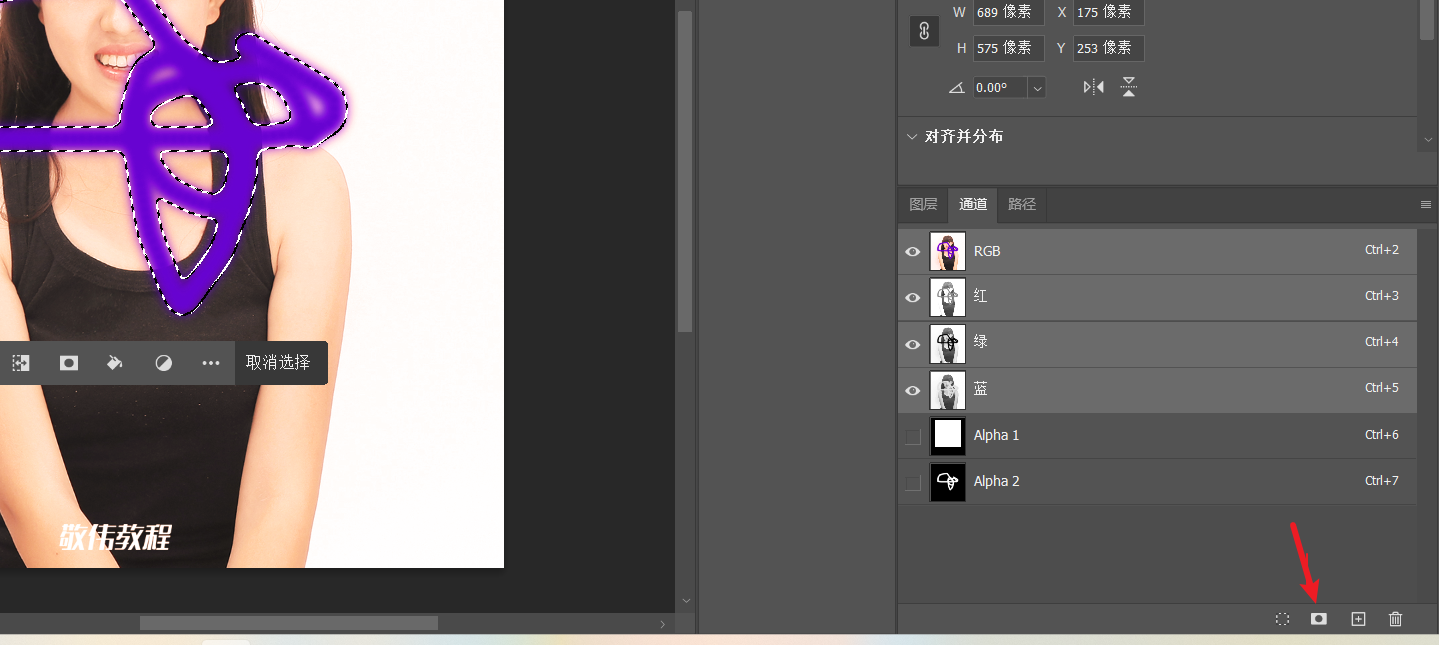 1.点右下角小圆圈 载入选区------2.点一下RGB 通道
