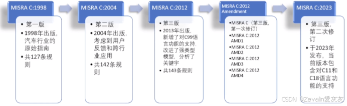 截止至2025年,MISRA C经过了如下的版本迭代,不过当前使用率最高的版本还是MISRA C 2012
