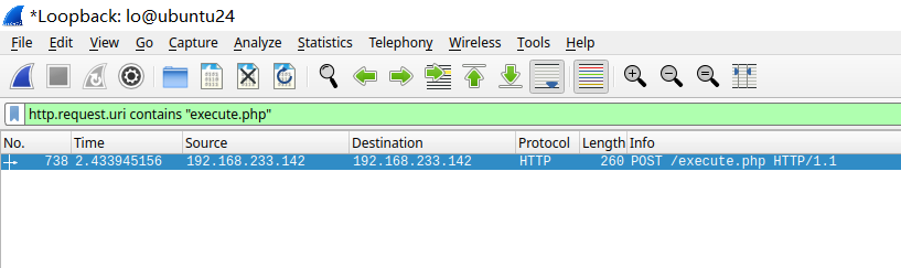 随后在Linux下运行wireshark,抓取loopback网卡,并直接输入筛选条件http.request.uri contains "execute.php"