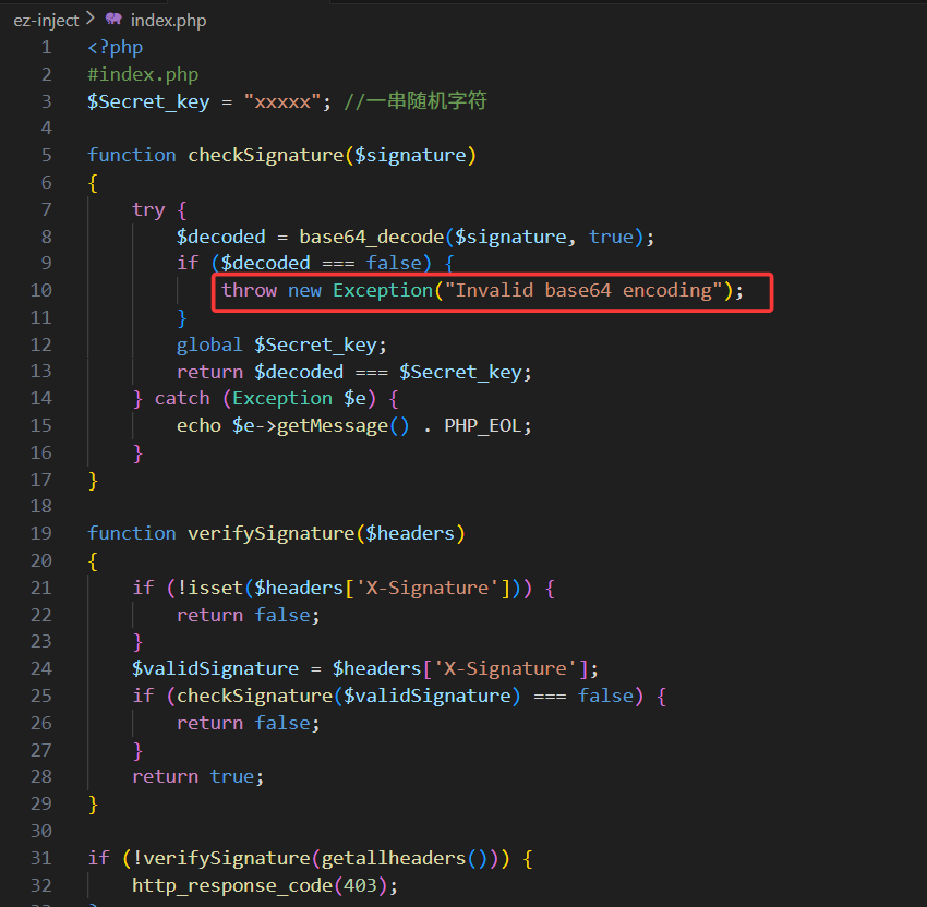 查看源码,可以发现,验证签名的逻辑其实就是检查请求头中的 X-Signature字段,将字段内容进行base64解码,再与 Secret_key 进行比对。但是在base64解码X-Signature时,存在严重的逻辑漏洞,如果X-Signature中的内容无法进行base64编码,则会抛出异常,但抛出异常后,并未结束进程,而是继续往下执行,这就是我们绕过签名验证的机会。