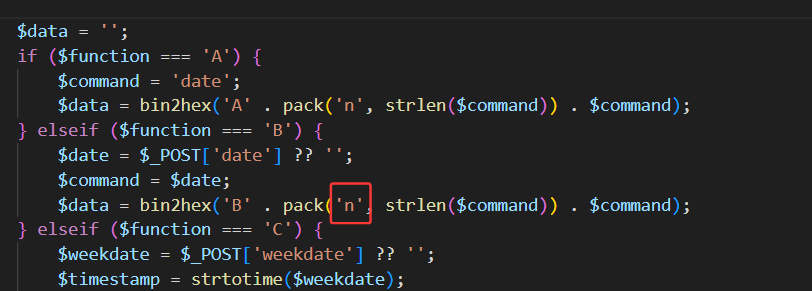 查看源码,ABC三个Function都将data构造成了二进制协议格式,首先是一位标识符(A/B/C),再使用了pack函数,将数据打包成二进制字符串,参数n表示无符号短整型(16位,大端字节序),strlen函数获取command长度,最后将要执行的命令拼接在最后面。这正好与上面讲的二进制协议报文结构一致