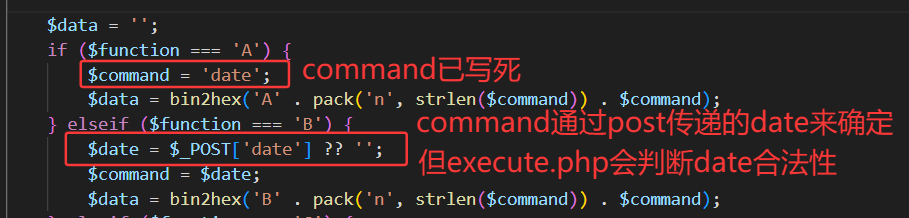 分析到这里,我们看到出现了疑似注入点system函数。B方法传入的日期虽然可控,但是会先检查传入值的合法性。只有标头为A,才会直接执行。但A方法的command又写死了,不可控,这道题好像又无解了?