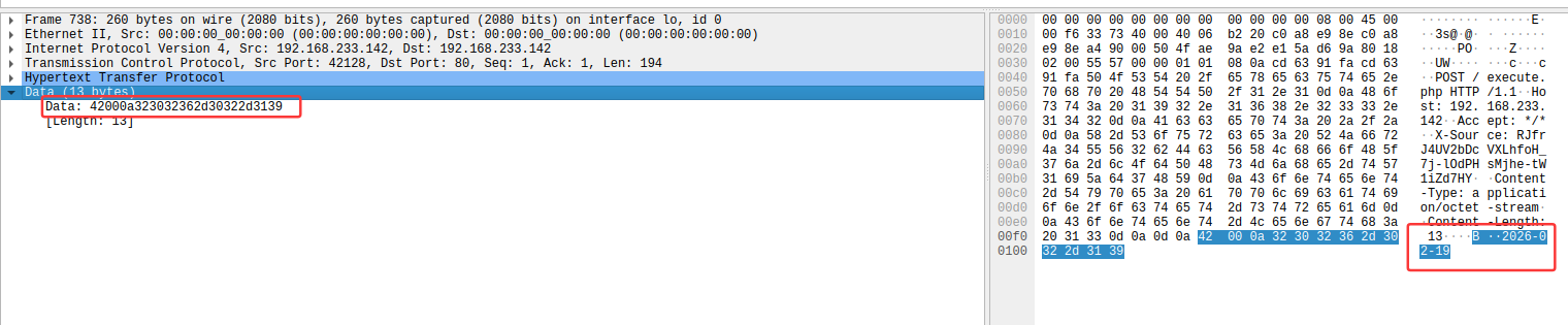 42是B的十六进制,代表了这次协议的标志B,十六进制中的a表示十进制的10,所以000a代表了这次请求载荷的长度是10,后面的323032362d30322d3139就是实际载荷2026-02-19