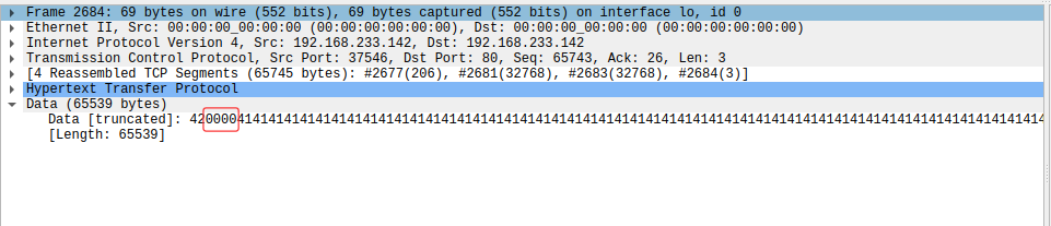 那么已知这里的长度字段最大值为ffff,如果超过这个值会怎样呢?我们将data写入65536个A
