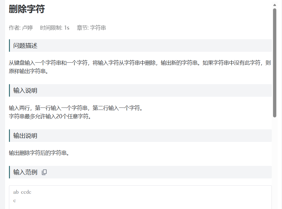 个人总结:数组接收数据,设置两个int变量指向当前遍历的下标(i)和所覆盖的下标(sum),当前下标所指数据为删除数据时,遍历下标++,其余条件两个下标同时++,最后遍历结束设置sum下标数据为'\0'(终止符)。%s输出数组即可。