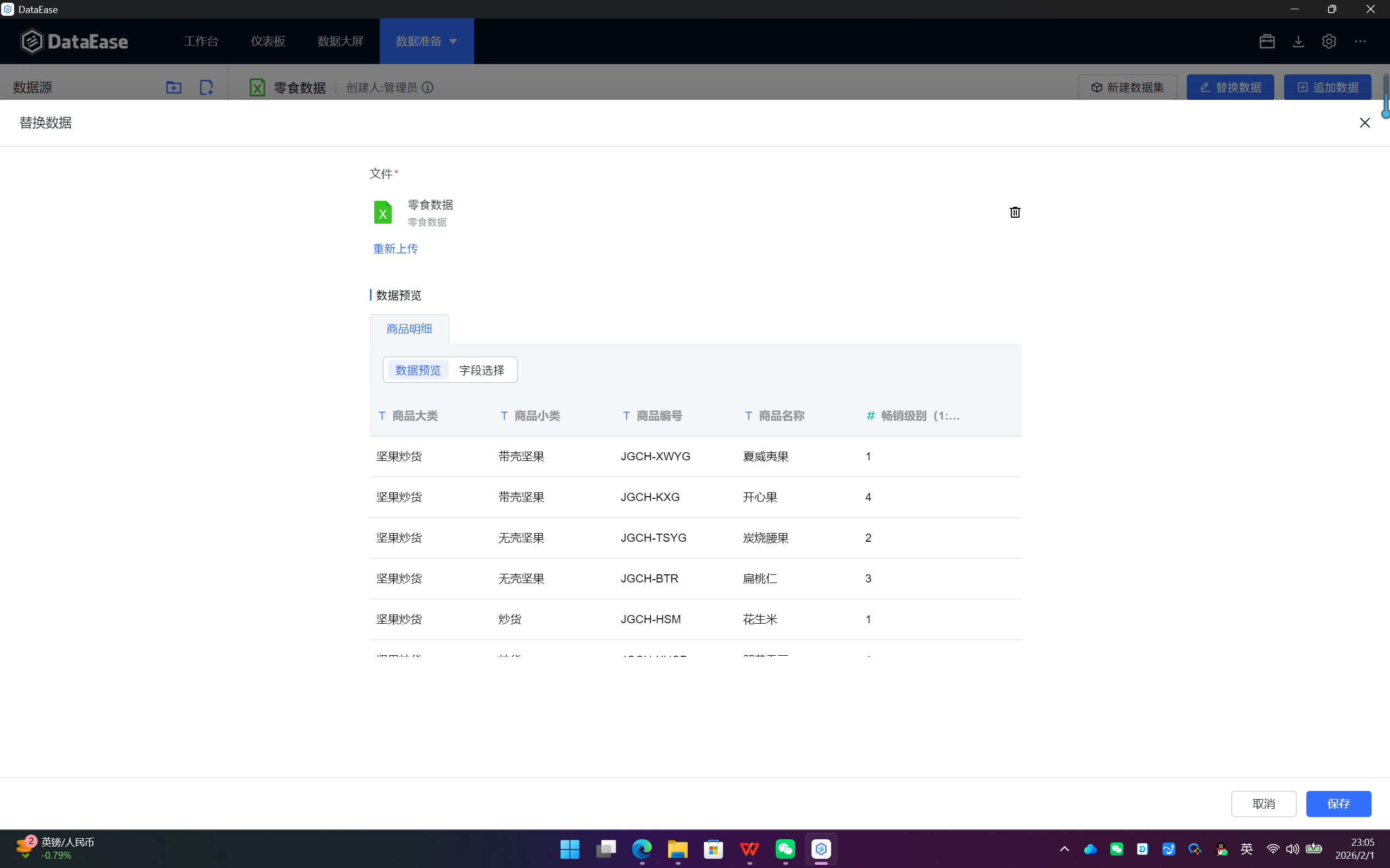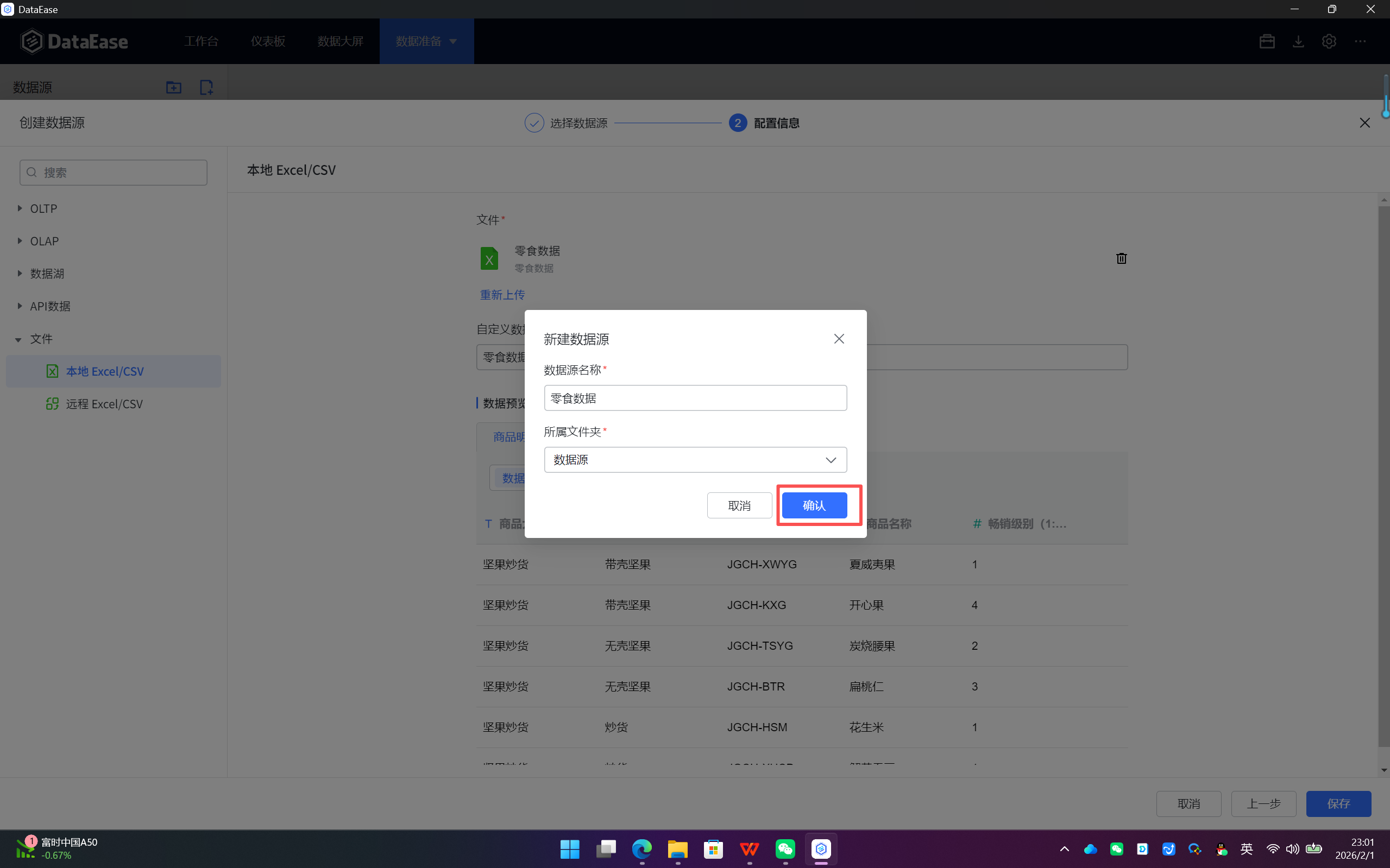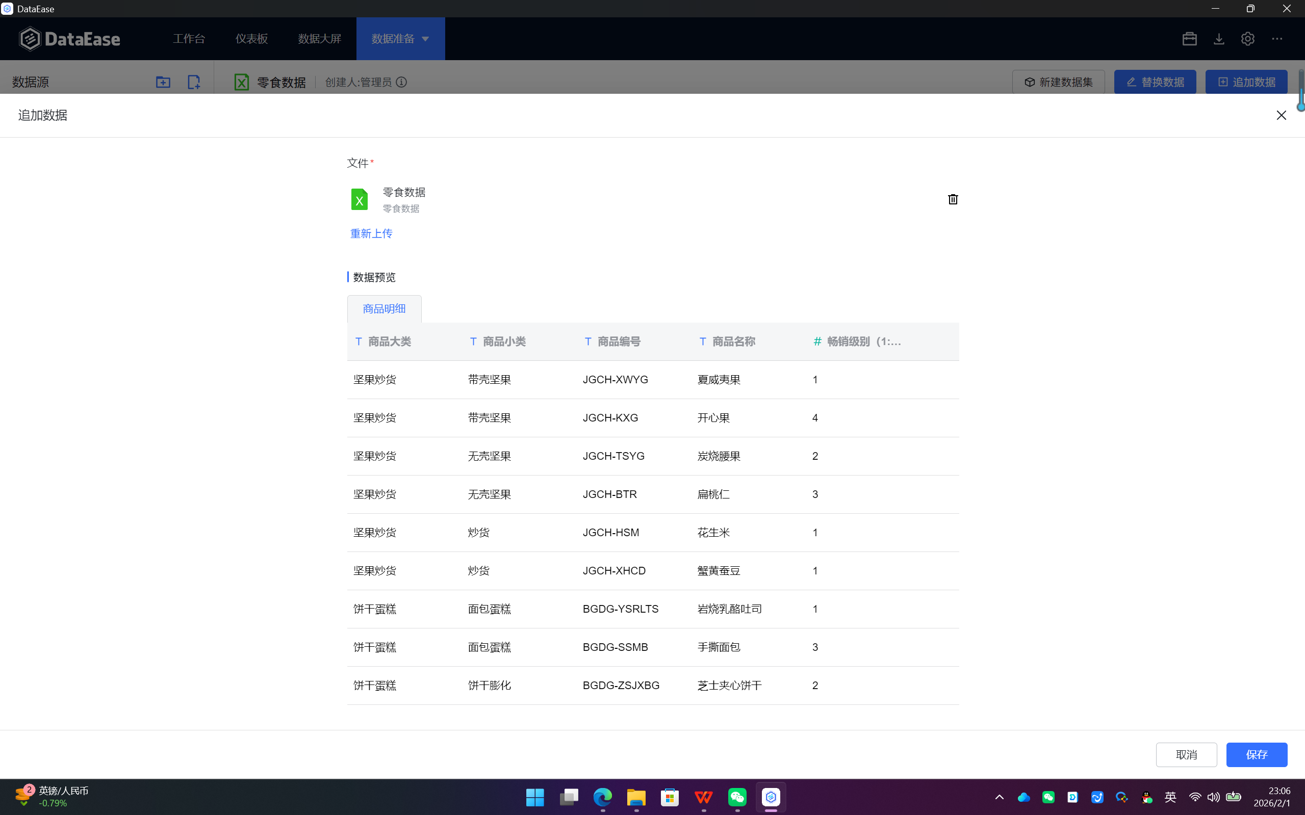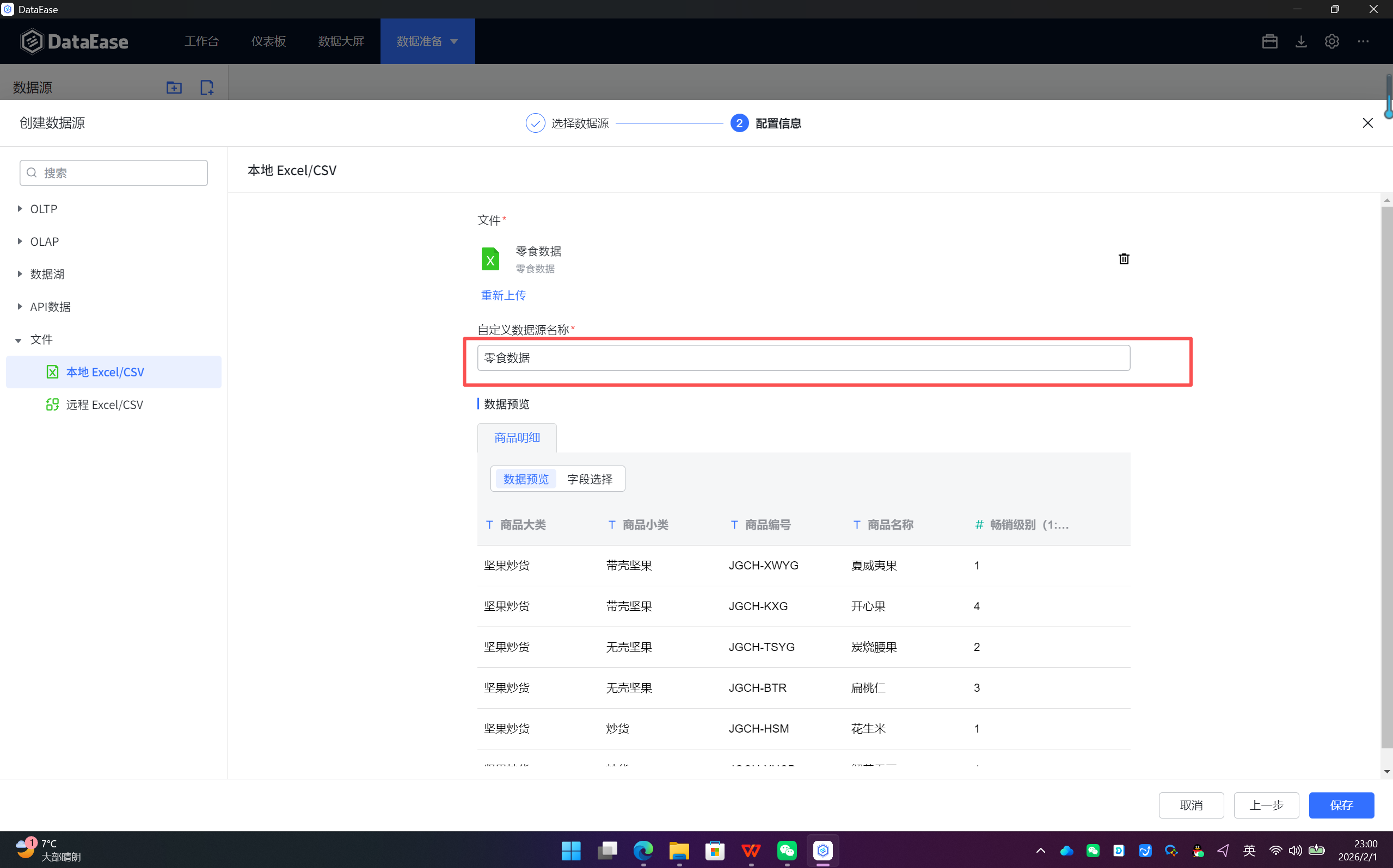 零食数据.xlsx)。 - 数据源名称:系统会自动用文件名填充,建议修改为一个更有业务意义的名称(如"2023年零食销售数据"),便于后续管理。