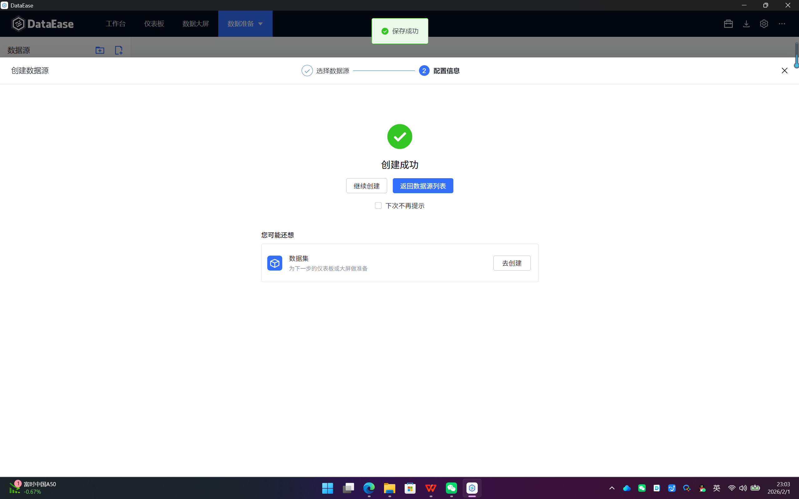 - 【继续创建】:基于此数据源立即开始创建数据集。