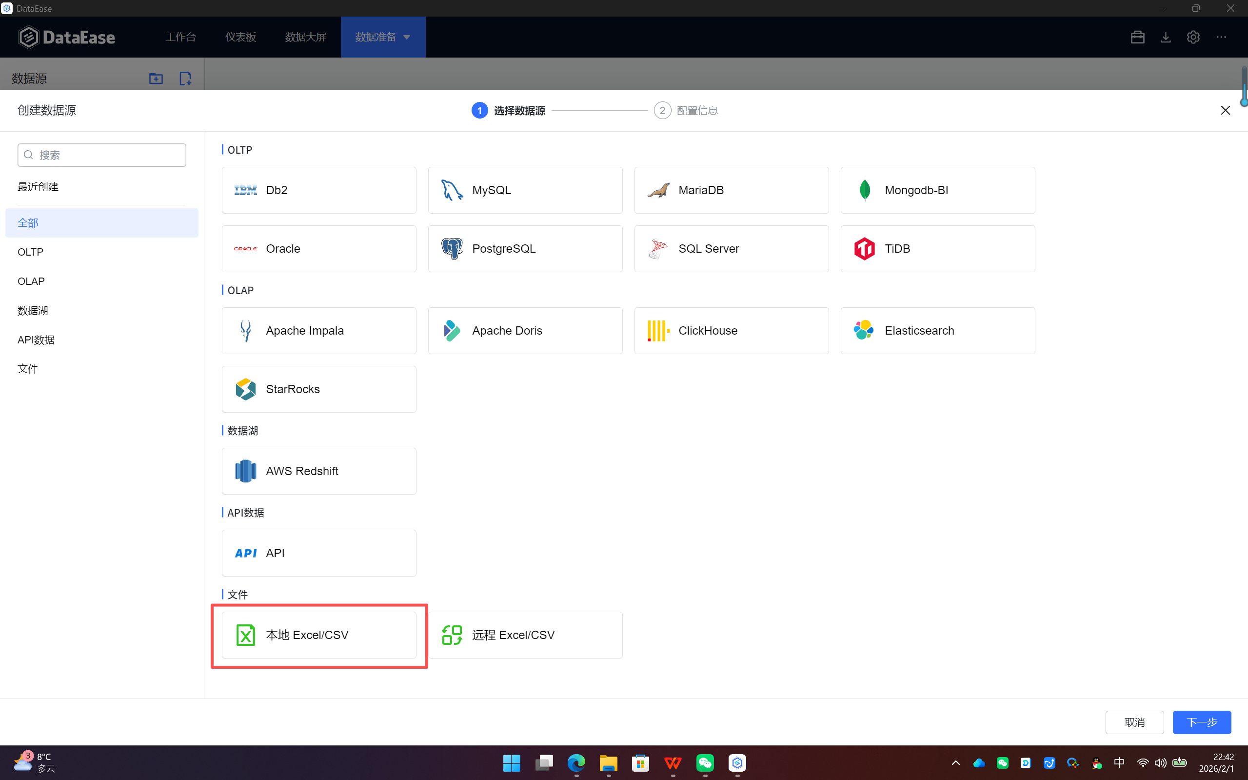 - 找到 【本地文件】 分类,点击其下的 【Excel】 图标,然后点击右下角的 【下一步】。