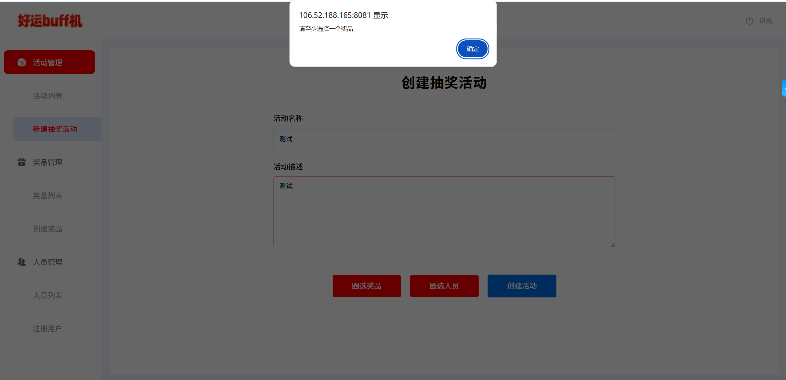 测试场景二:填写活动名称和奖品描述,未圈选奖品和人员