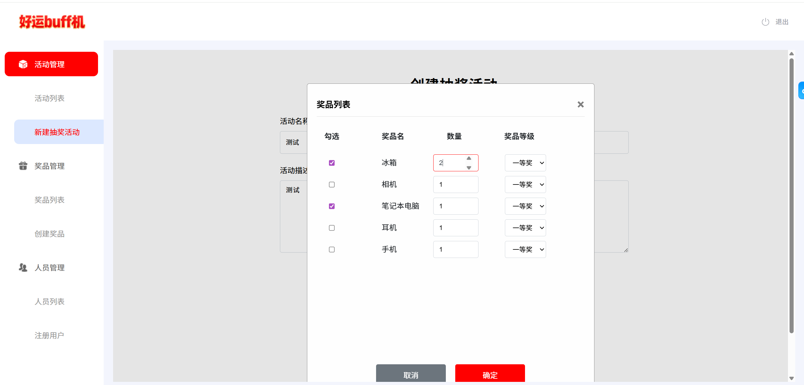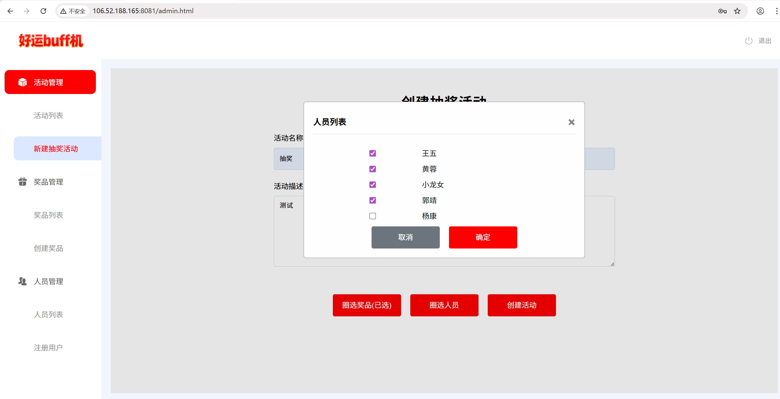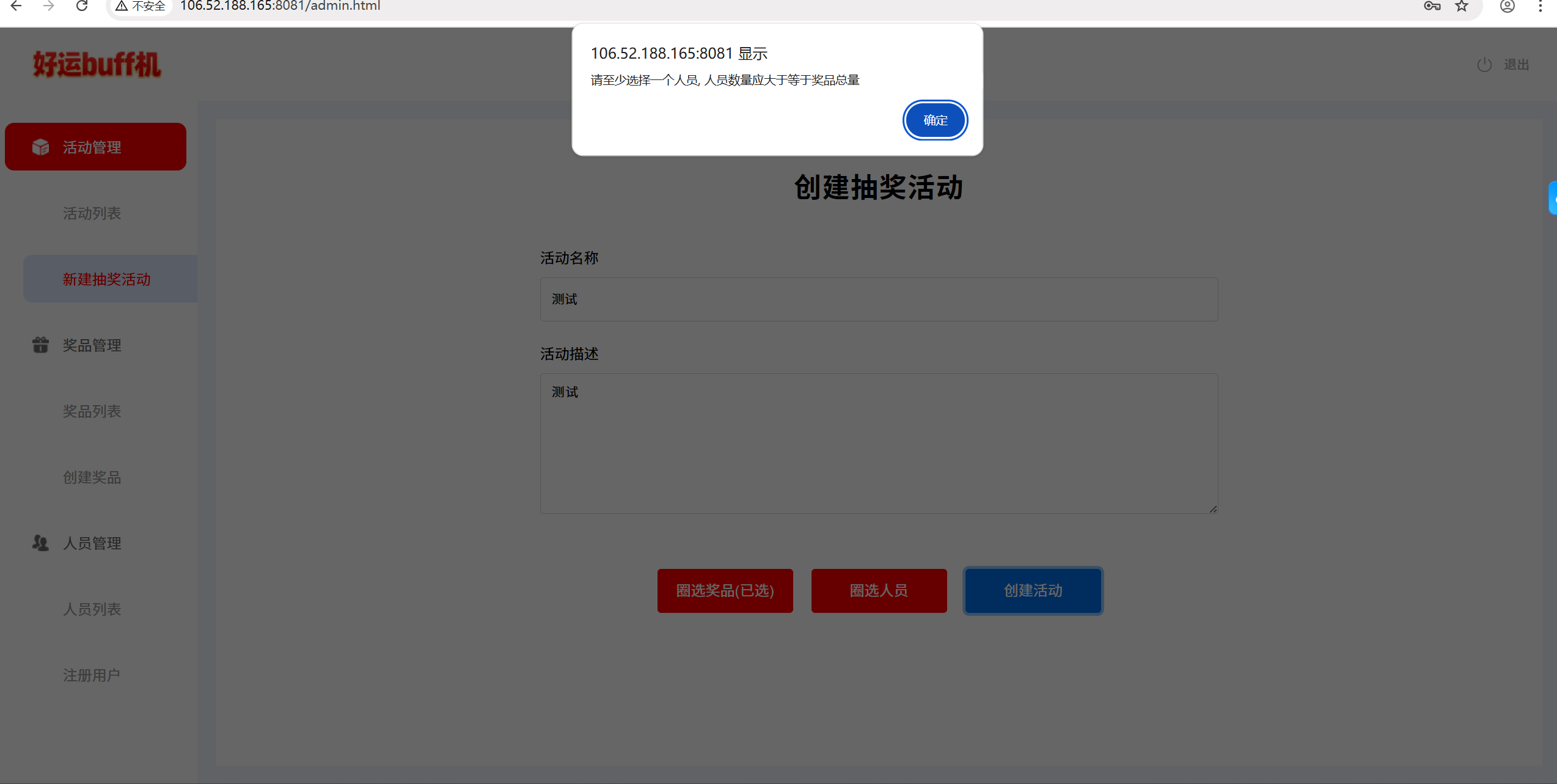测试场景四:填写活动名称和奖品描述,圈选奖品,圈选人员(圈选人员人数比奖品少)