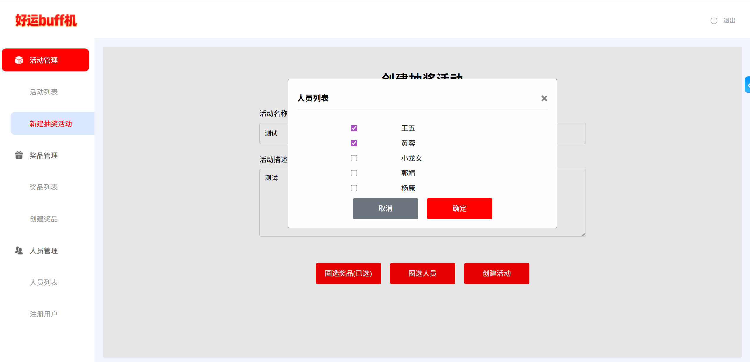 测试场景五:填写活动名称和奖品描述,圈选奖品,圈选人员(圈选人员人数比奖品多)