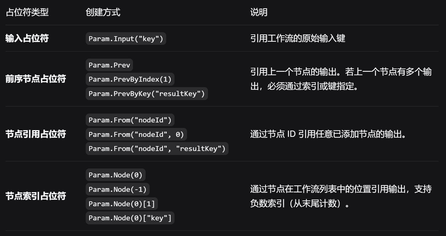 这些占位符可以灵活组合,并且支持链式索引器。例如,Param.From("nodeA")["resultX"] 明确表示引用节点 nodeA 的输出中键为 "resultX" 的那个值。