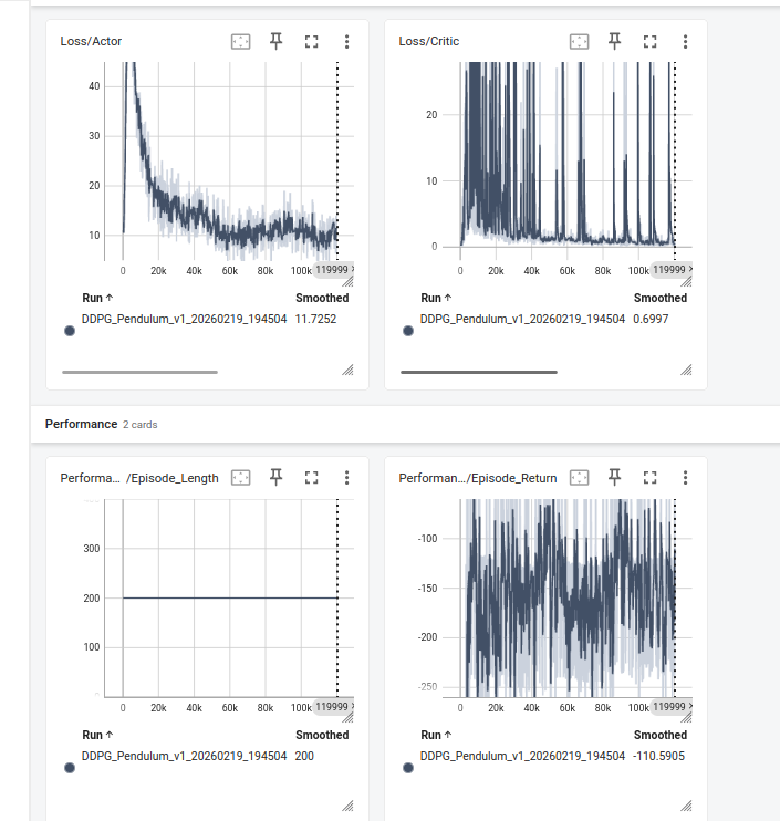 在性能指标方面,Episode Length 始终维持在 200(环境最大步数),说明策略未出现异常提前终止情况。Episode Return 从初期的较低水平逐步提升,并稳定在约 -110 左右,相较于随机策略(通常低于 -1000)已显著提升,表明算法成功学习到了有效控制策略。