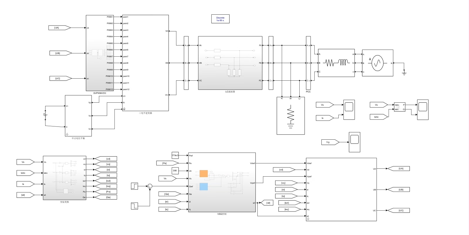 三电平VSG并网系统(理论推导) 控制环路:虚拟同步发电机控制+电压电流双闭环控制 拓扑:二极管钳位型三电平逆变电路 滤波器:LC滤波器 并网等级:380V 调制:SVPWM 中点电位:硬件电路实现平衡 工况:一次调频网侧频率下降0.2Hz 网侧电压下降0.2pu 功率等级:170kW 结果:系统具备同步发电机特性,当网侧发生频率暂降时,系统能够参与一次调频,增发有功功率 当网侧电压发生暂降时,系统增发无功功率,实现电压支撑。 任意时刻电压电流THD<5%符合并网要求
