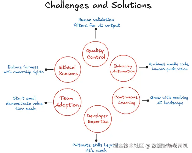 下图总结了 AI 辅助开发的挑战与潜在解决方案: