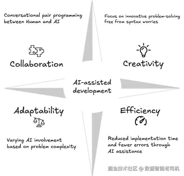 协作(Collaboration) 是基础原则:开发者与 AI 工具以一种对话式的方法共同工作,更像结对编程(pair programming),而不是仅仅把 AI 工具当作自动补全。只有当双方都积极贡献解决方案时,这种伙伴关系才能发挥作用:人类提供方向与上下文,AI 提供实现选项、技术与优化建议。